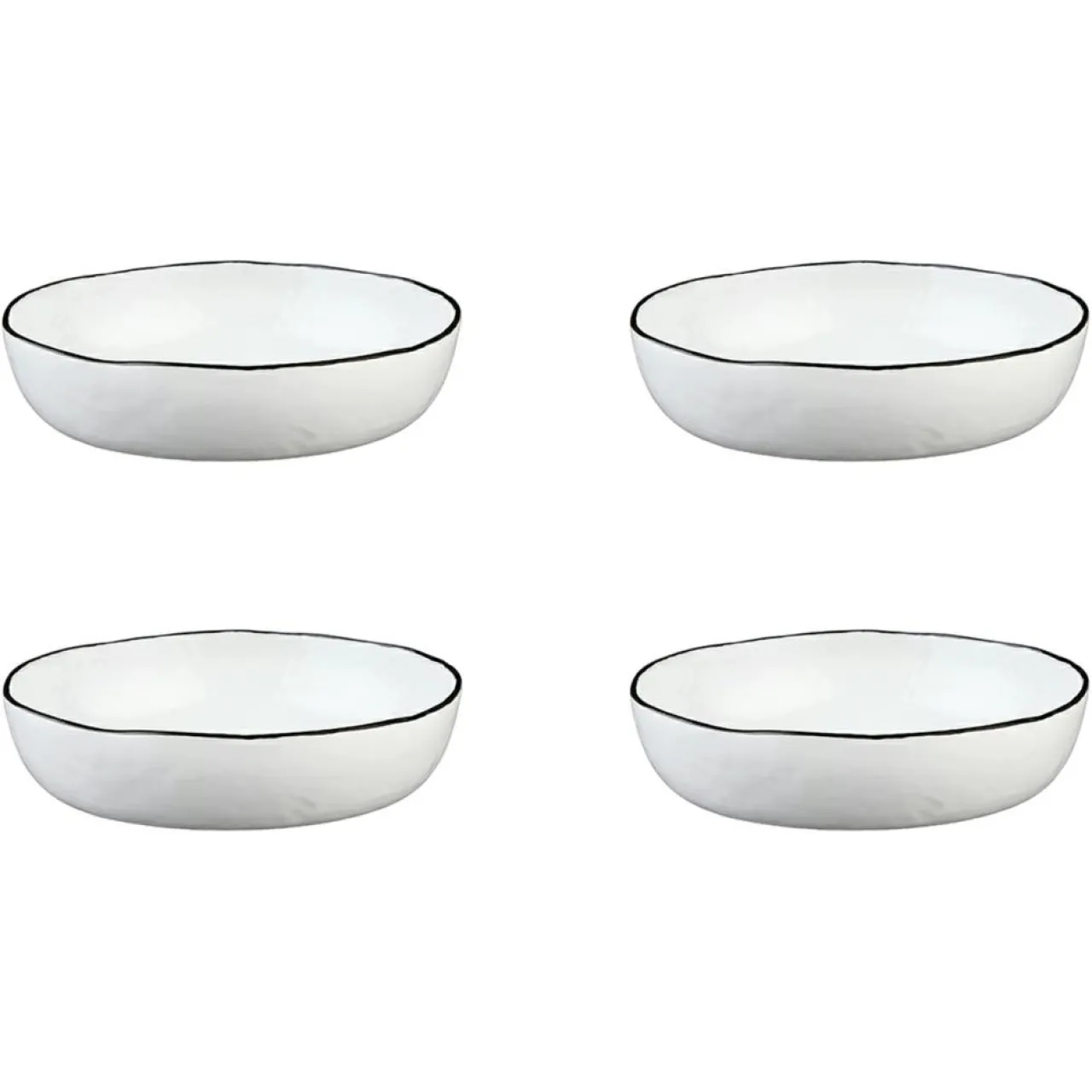 Un liseré noir délicat encadre chaque pièce, ajoutant un contraste moderne à la céramique d’un blanc éclatant