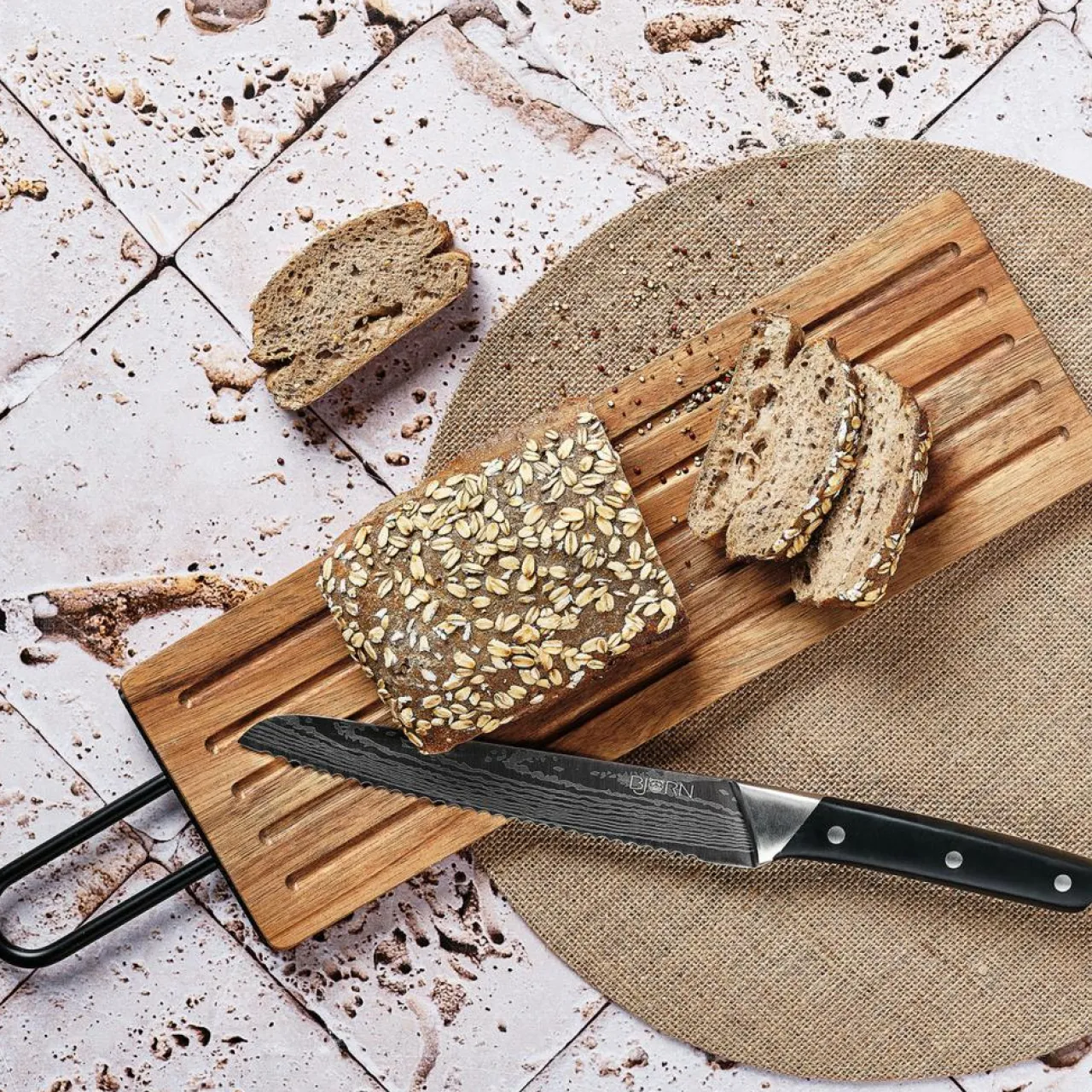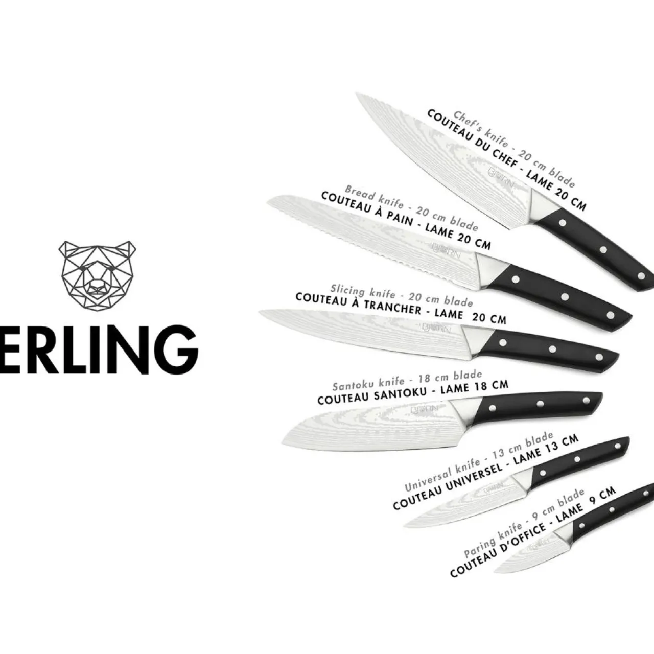 Les couteaux ERLING associent la tradition avec un solide manche riveté et la modernité avec une lame tranchante en acier inoxydable qui présente un effet damas