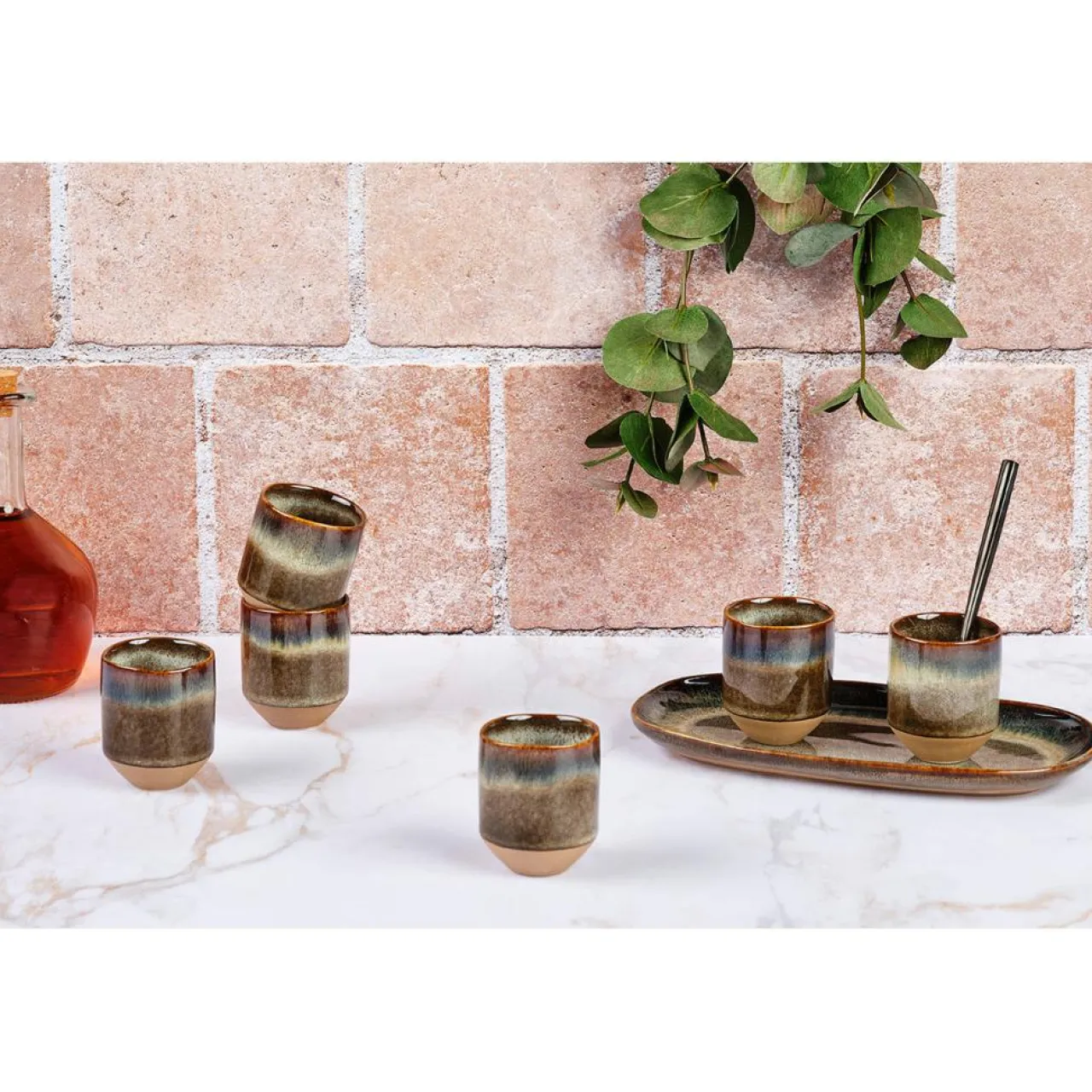 Après une première cuisson de l’argile à basse température, des émaux réactifs de couleurs différentes s’appliquent sur le grès et lui donnent un relief unique et éclatant. L’apparition de nuances de teintes que l’on retrouve d’une pièce à l’autre est le résultat d’un savant mélange artisanal des techniques de cuisson et du mode d’application de l’émail.