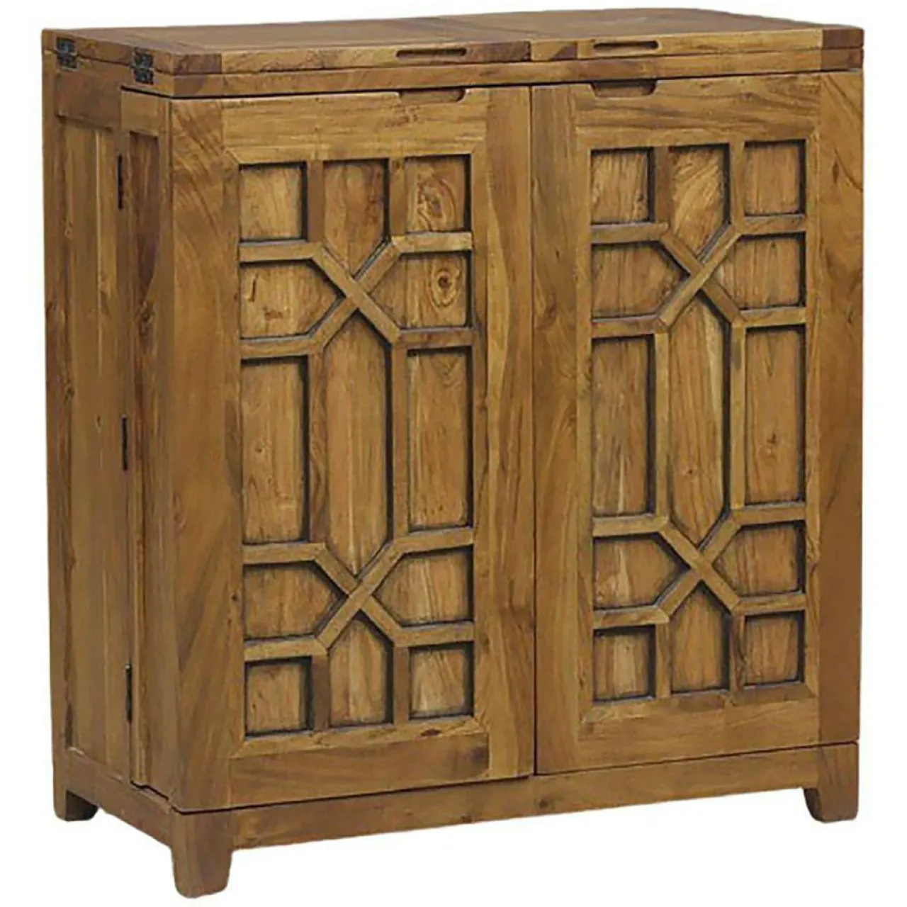 Personnalisez votre décor avec ce meuble bar pliant en bois exotique et imprégnez-vous du mélange des cultures indiennes et orientales. Essence de bois sélectionné, savoir-faire ancestral, sont les qualités essentielles à la réalisation de cette pièce qui se singularise par ses finitions sculptées.