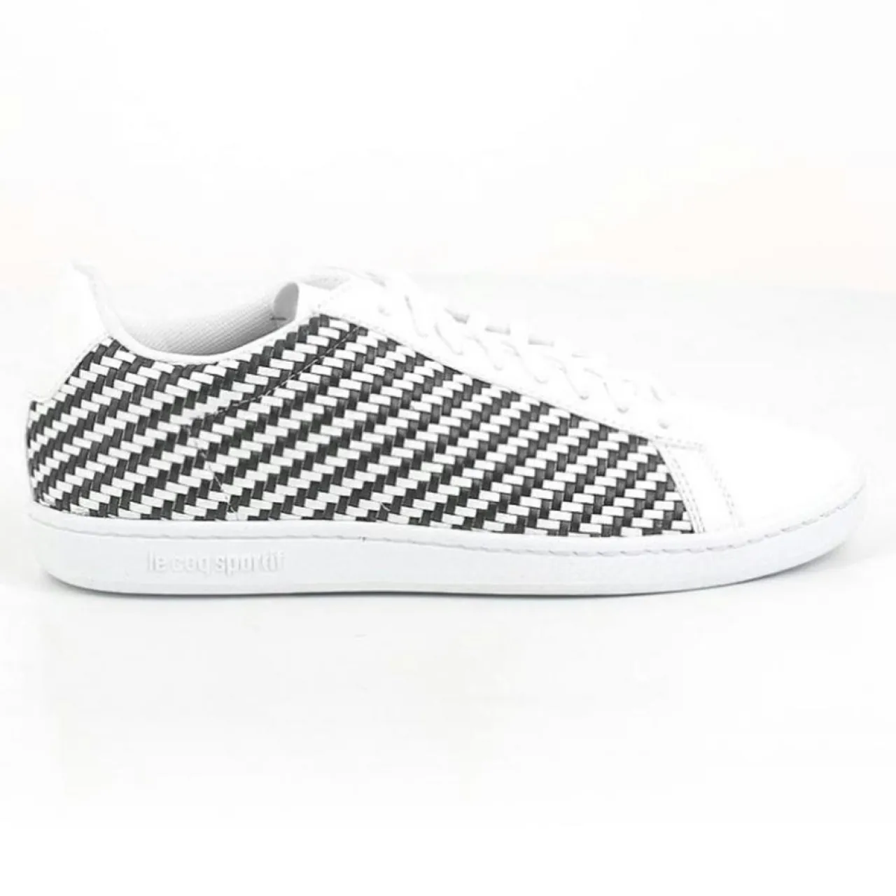 La nouvelle arrivée affiche un motif géométrique en noir et blanc tressé en polyuréthane.