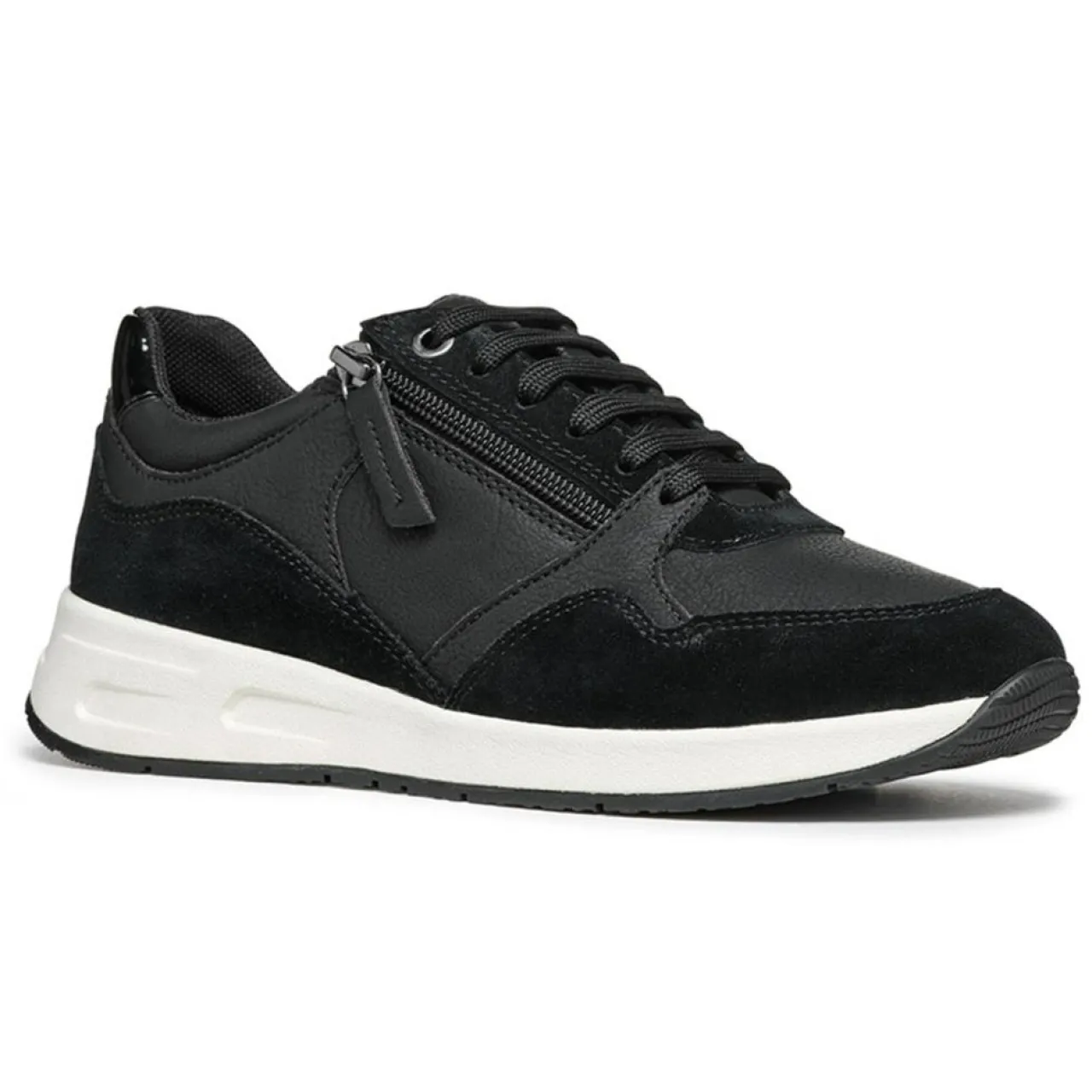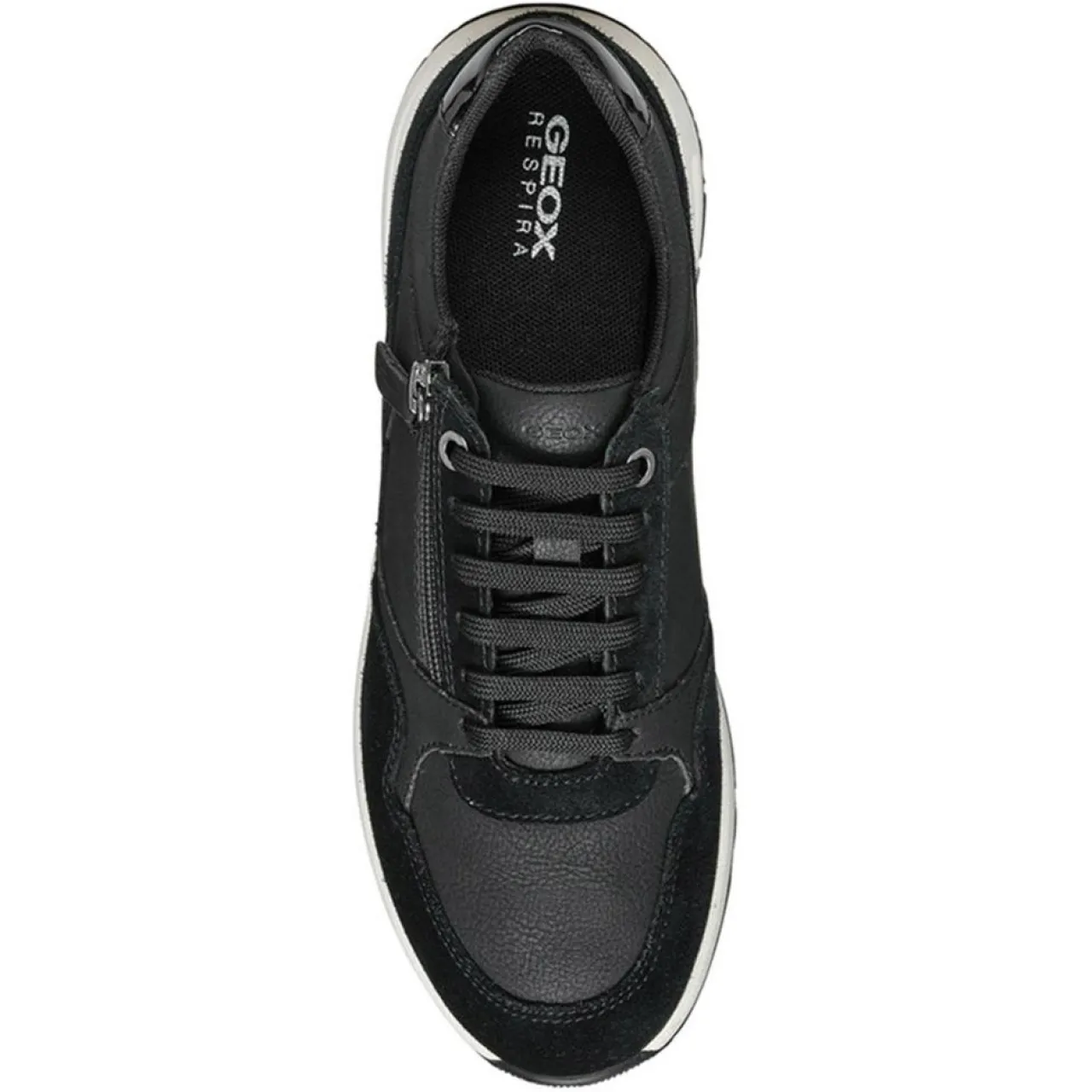 Ces baskets basses Geox présentent des empiècements en cuir suédé ou grainé, un bout arrondi, un laçage 6 œillets sur une languette siglée, une fermeture zippée et un col vernis.