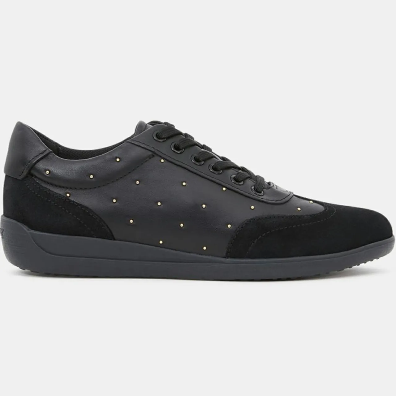 Ces baskets basses Geox confectionnées en cuir de vachette et suède, présentent des studs dorés décoratifs, 6 &oeligillets de laçage, une semelle intérieure respirante en cuir ainsi qu’une semelle extérieure en caoutchouc semi-perforé.