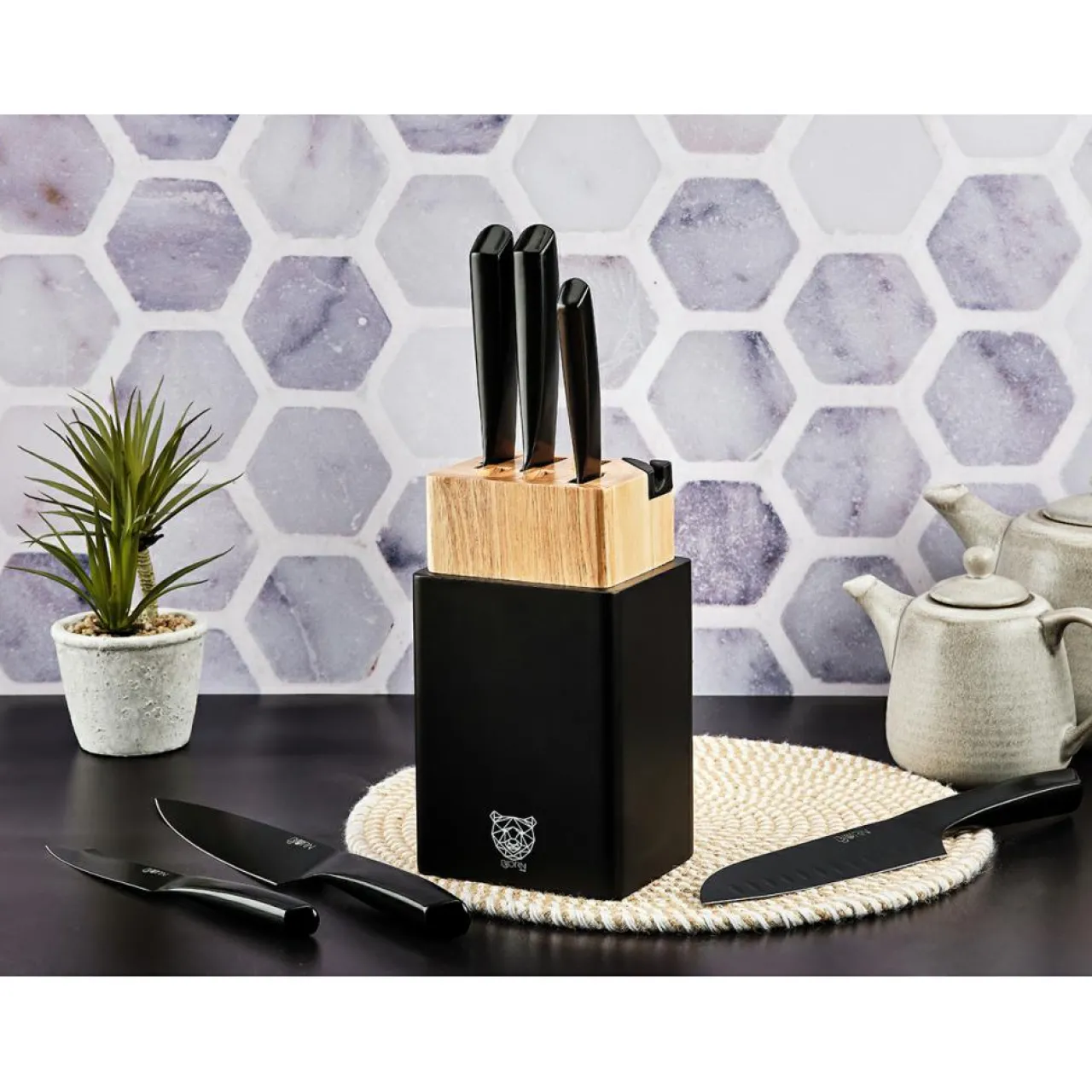 Le design irrésistible du bloc couteaux PORVOO réside le revêtement noir mat au toucher velours qui borde un cube en bois massif