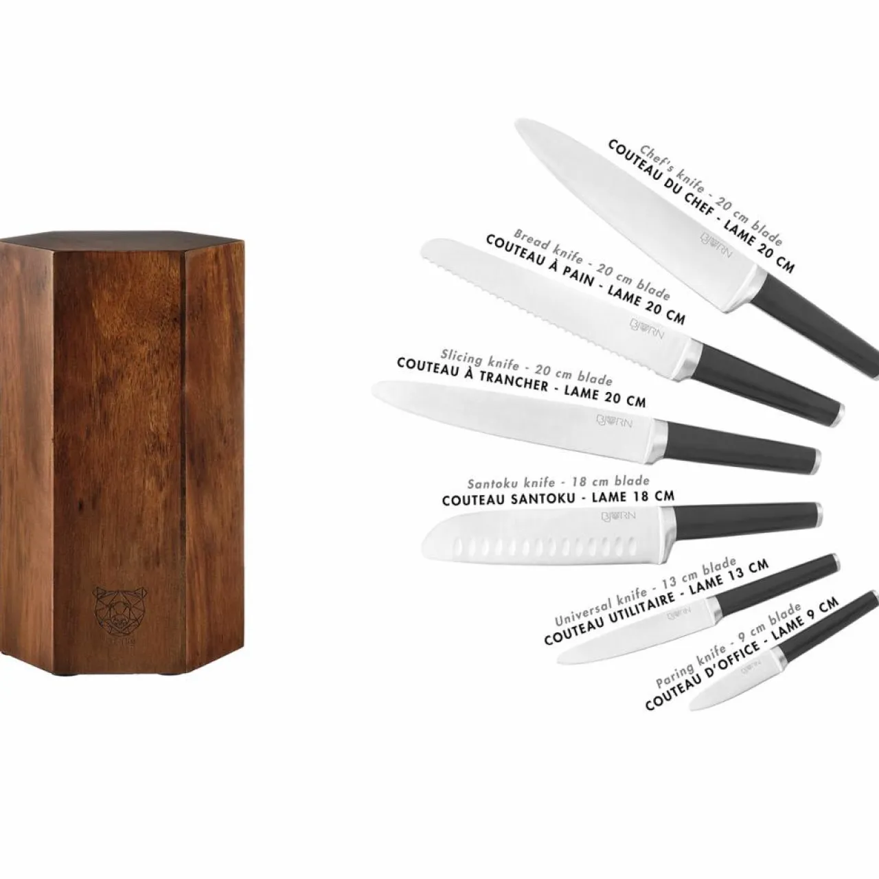 – Contient 1 couteau d’office (lame 9cm) + 1 couteau universel (lame 13cm) + 1 couteau Santoku (lame 18cm) + couteau à trancher (lame 20cm) + 1 couteau à pain (lame 20cm) + 1 couteau chef (lame 20cm) + 1 bloc couteaux universel magnétique