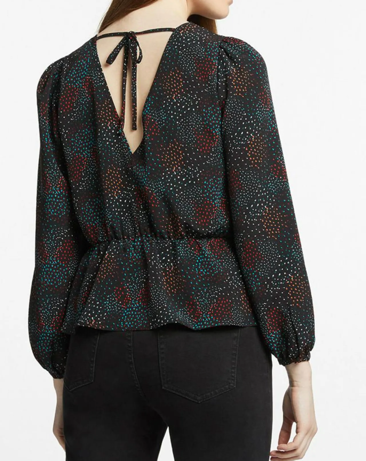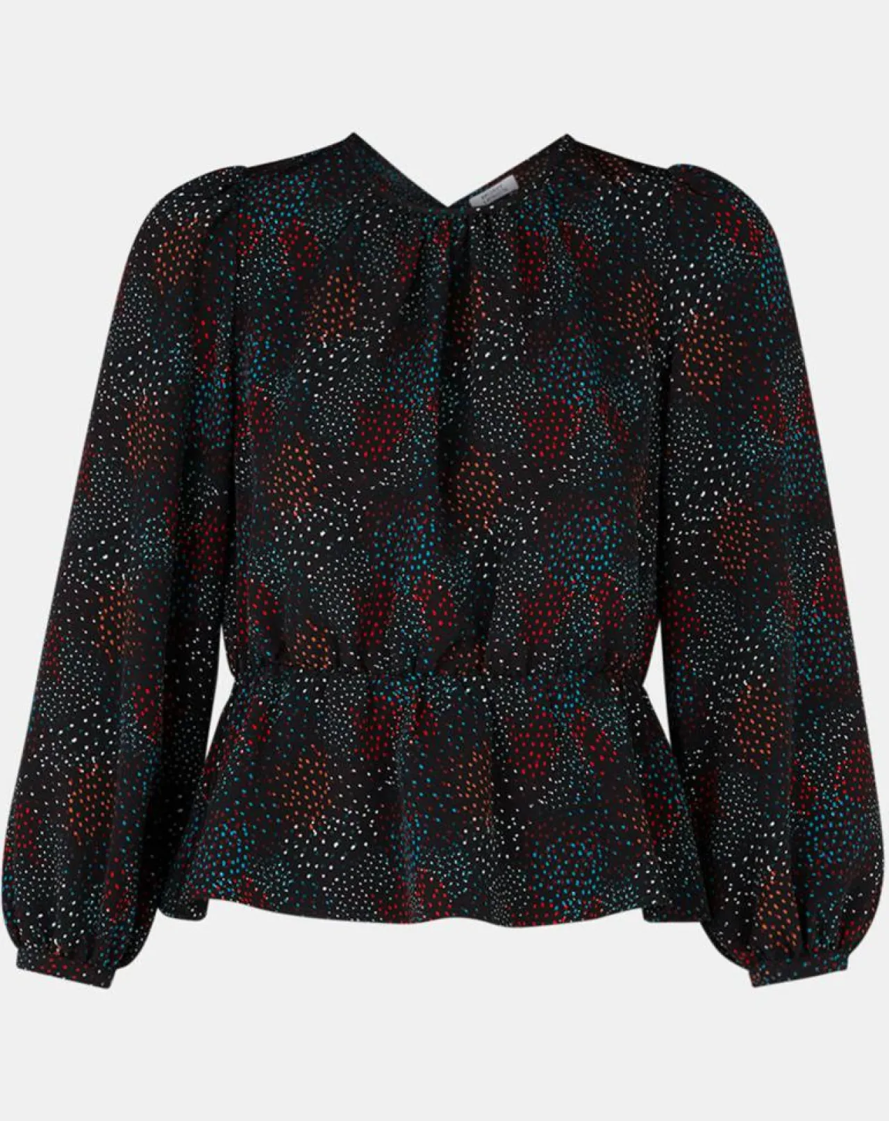 Cette blouse fluide Galeries Lafayette présente un imprimé moucheté, des manches longues, un col rond avant, un décolleté V au dos avec liens à nouer et une basque.