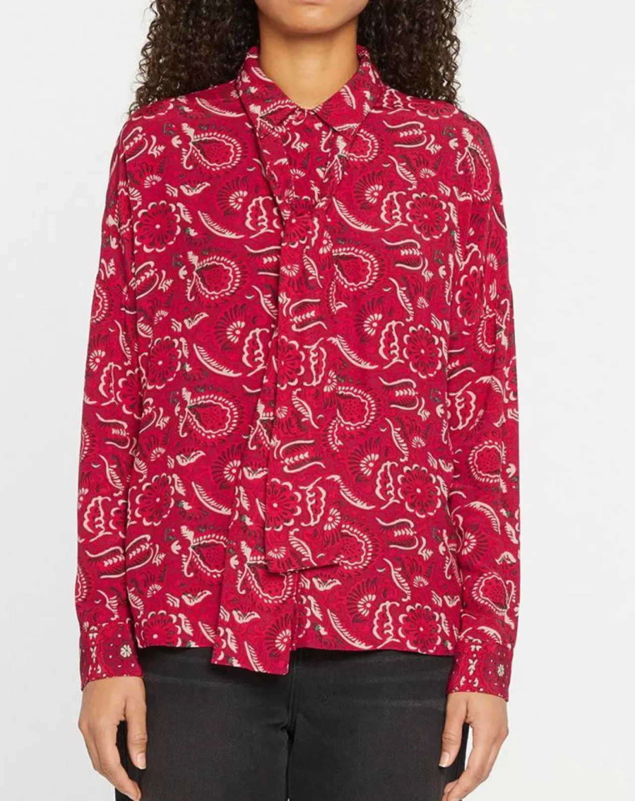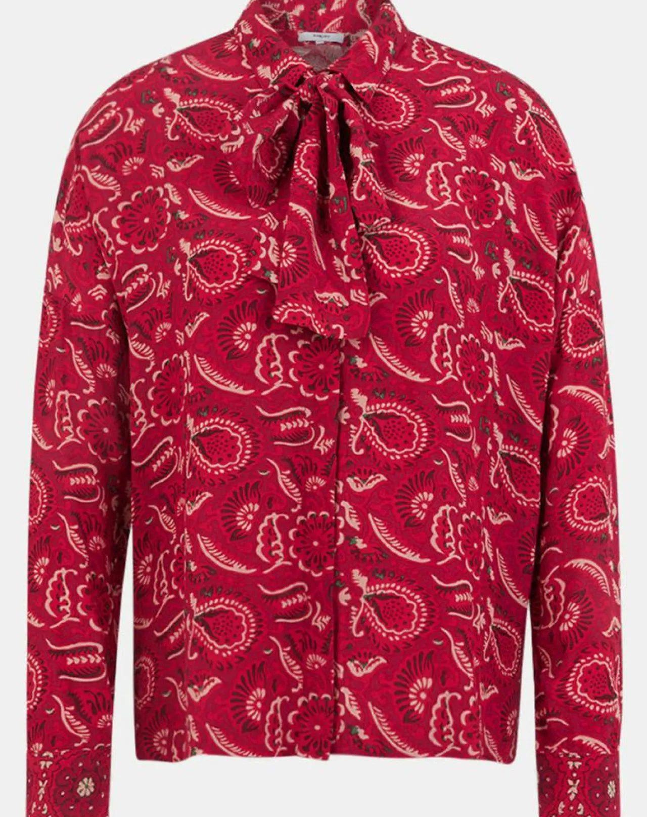 Cette chemise droite fluide Suncoo présente un imprimé fantaisie, un col lavallière, une fermeture boutonnée sous patte et un ourlet fendu.