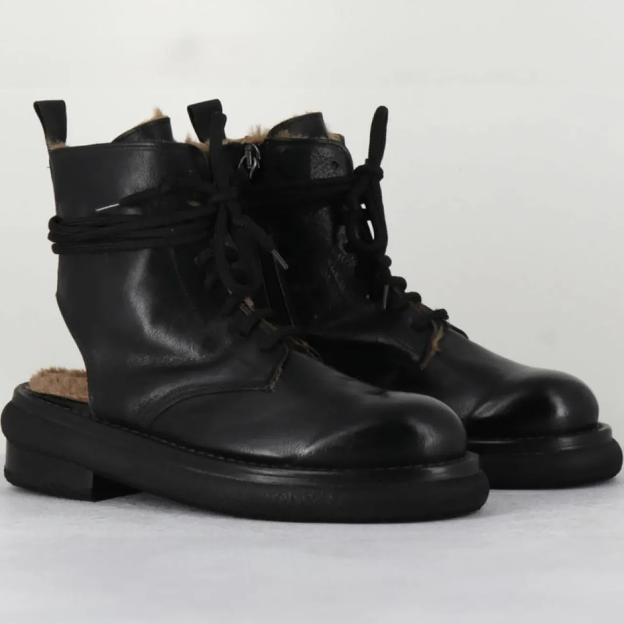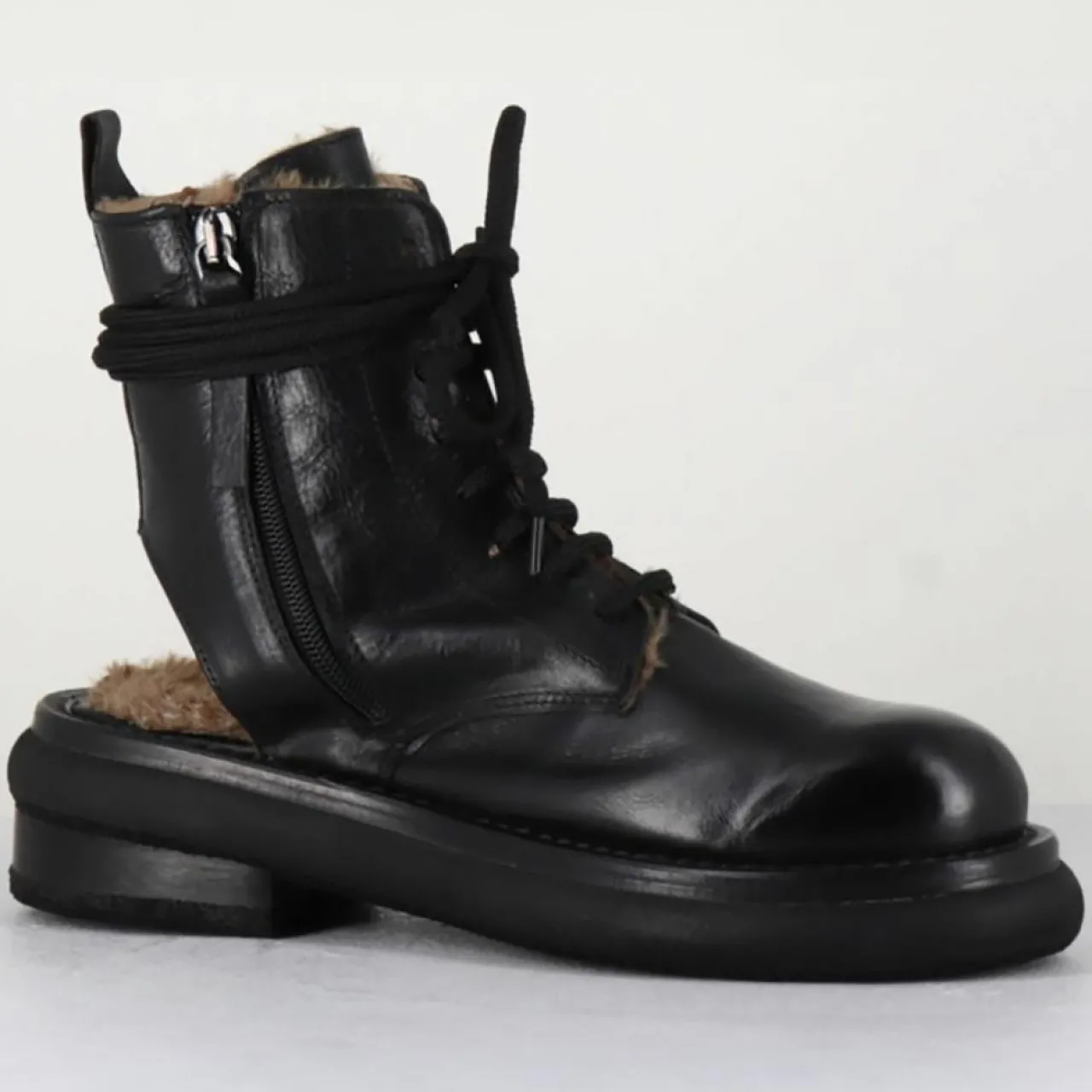 Rangers fourrée en cuir noir, bout amande, lacets noirs, zip intérieur, ajouré à l’arrière, montées sur une semelle stylisée, multi-matières :cuir et micro fibre texturés.