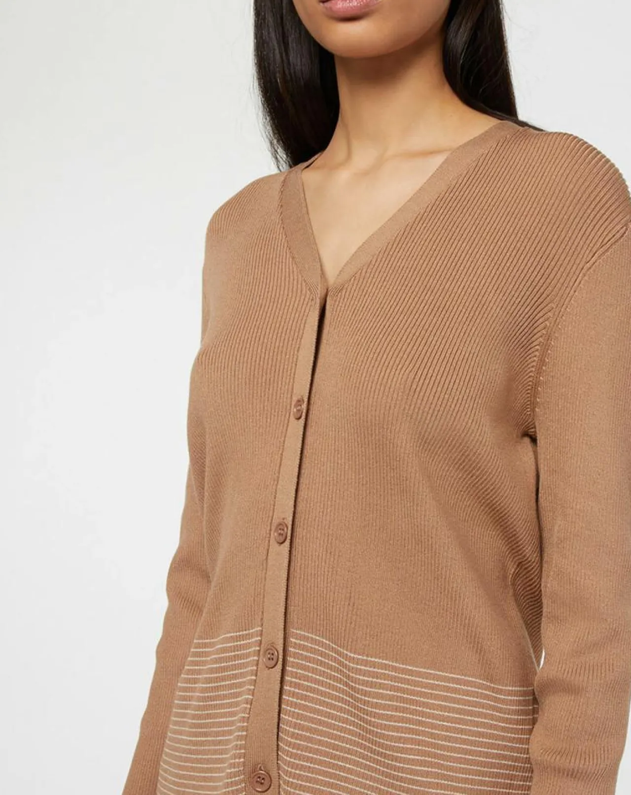 Ce gilet droit Jodhpur en maille côtelée est muni d’un col V, de manches longues, d’une fermeture boutonnée et de fines rayures aux poignets ainsi qu’à la base