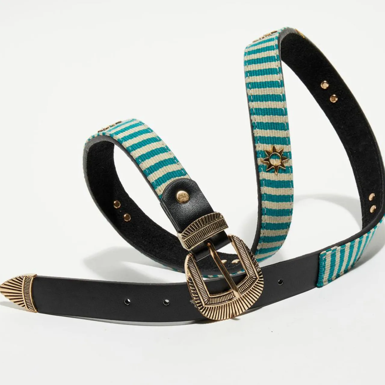 Vous serez fan de cette ceinture en cuir noir, décorée d’un ruban mexicain aux couleurs écru et turquoise qui est orné de rivets argentés en forme de soleil