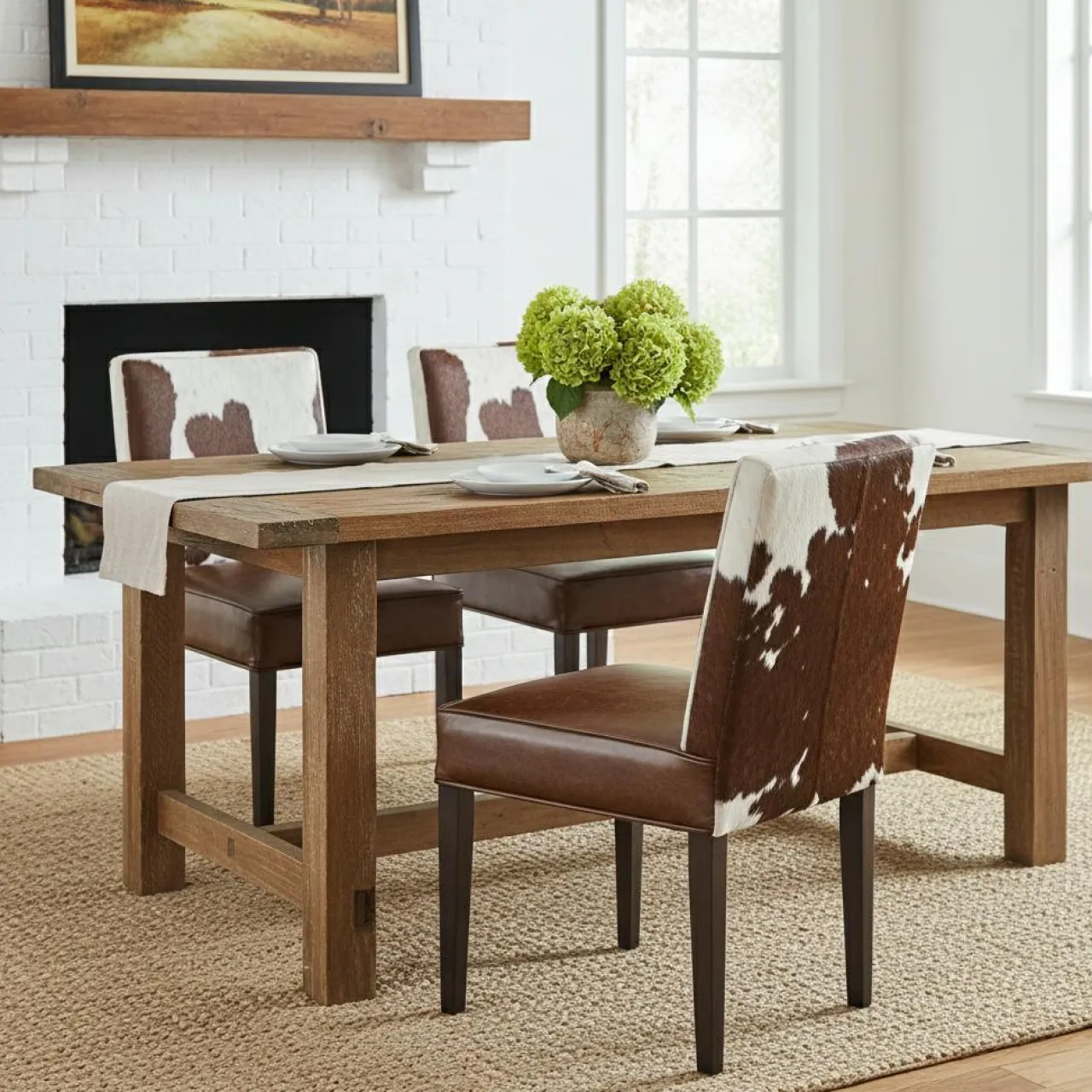 La structure en bois massif d’acacia assure une stabilité solide et une esthétique rustique, accentuant le contraste entre la chaleur du bois et la robustesse du cuir de vache. La finition noisette apporte une touche de sophistication et de raffinement à cette chaise, la rendant aussi belle à regarder qu’à utiliser. À noter, chaque modèle étant réalisé en cuir naturel, les variations dans les motifs et les nuances de couleur sont à prévoir ce qui rend cette chaise cuir de vache unique.