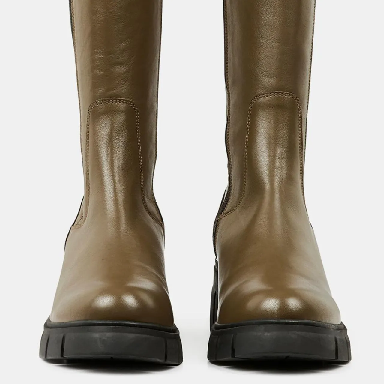Ces bottes hautes à talon Galeries Lafayette en cuir de vachette lisse sont munies d’un bout arrondi, d’un gousset élastiqué, d’une fermeture zippée sur le côté intérieur et d’un talon large.