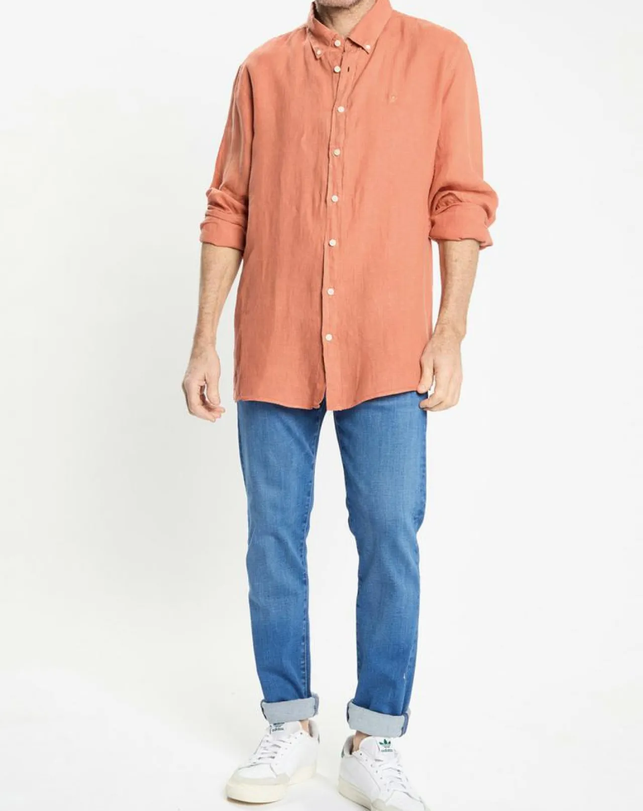 Cette chemise ajustée Hackett London en lin est munie d’un col américain, de manches longues aux poignets ronds 1 bouton ajustable, d’une fermeture boutonnée, du logo brodé ton sur ton sur la poitrine et d’une base arrondie