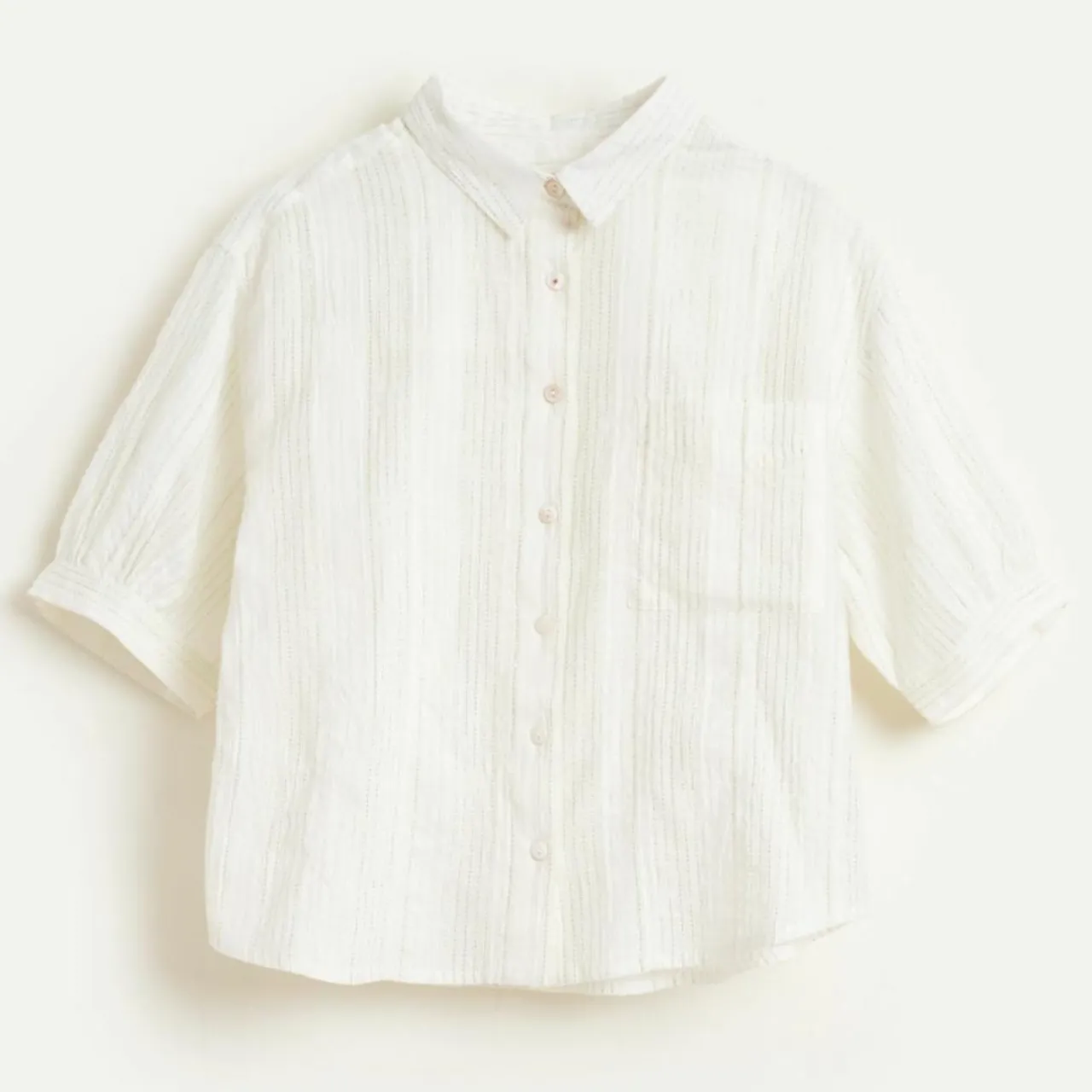 Quelques plis discrets qui donnent un peu de volume aux manches et un coton aux fines rayures lurex qui apportera une touche brillante à son look