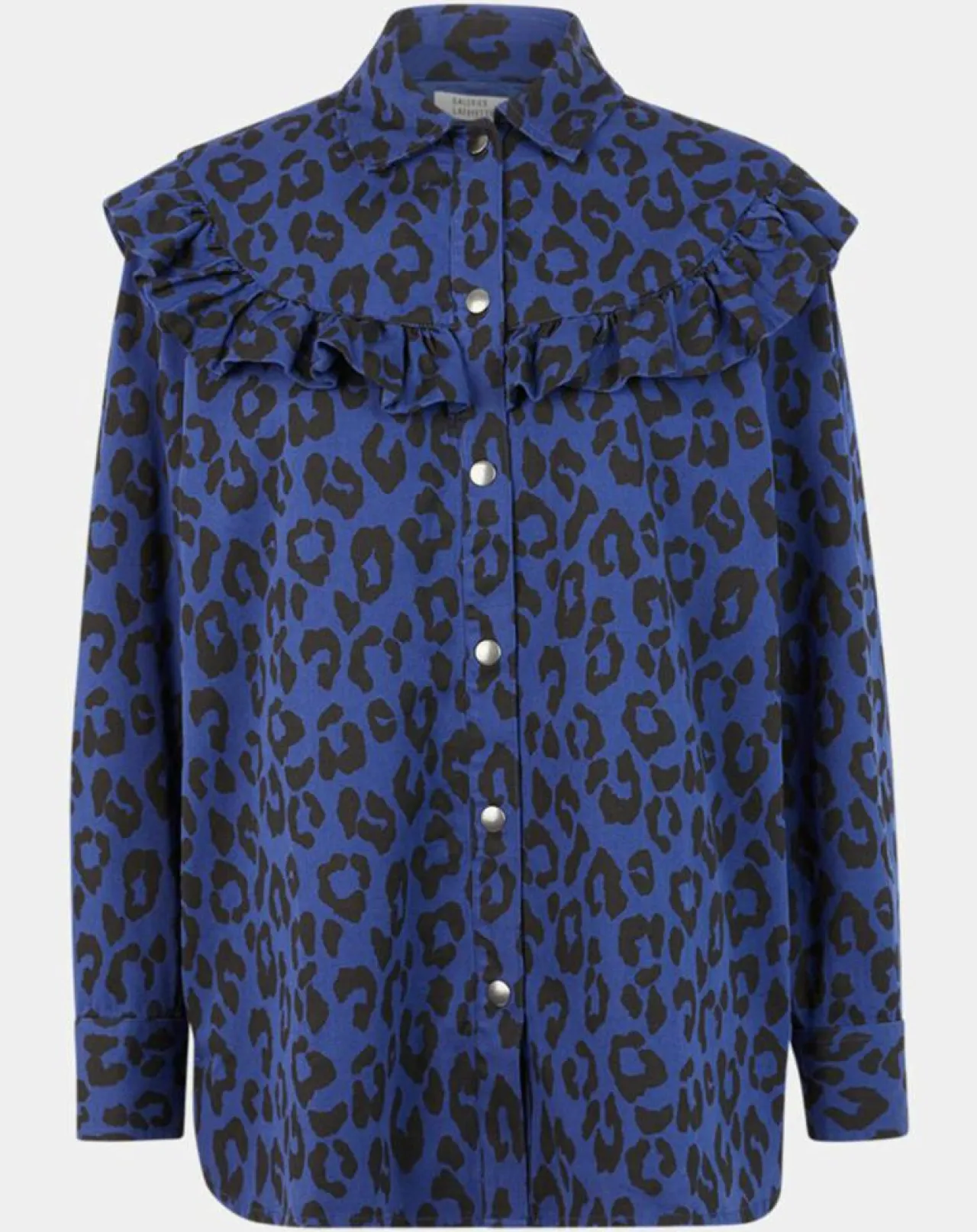 Cette chemise droite Galeries Lafayette en coton bio à imprimé léopard, est munie d’un col classique, de manches longues, d’une fermeture par boutons pression ainsi que d’un volant sur la poitrine.