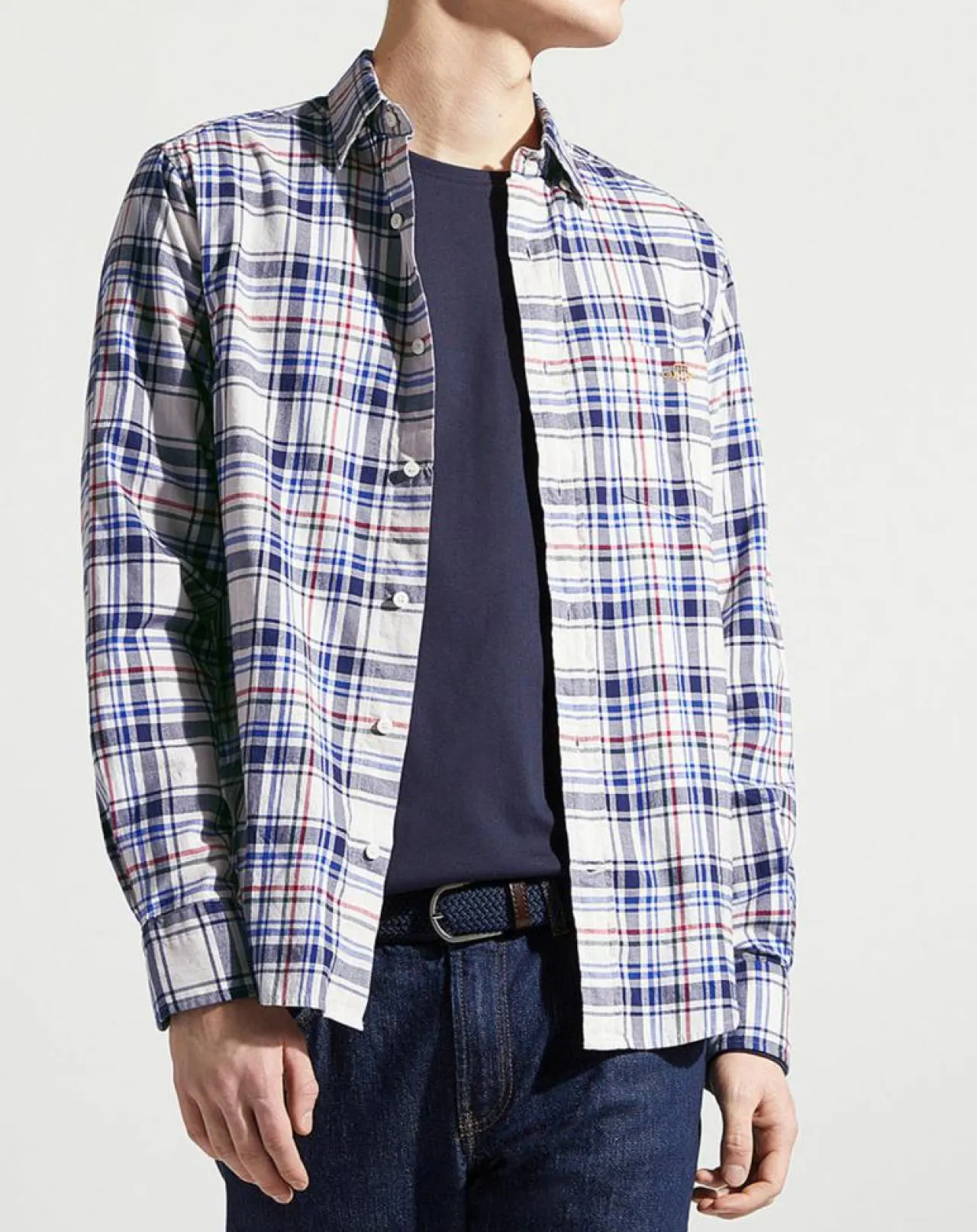 Cette chemise droite Gant en coton twill présente un imprimé tartan, un col américain, une fermeture boutonnée, une poche plate poitrine ornée du logo et de la signature ainsi que des poignets ronds 1 bouton ajustable