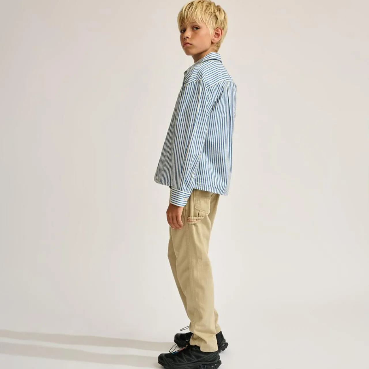 Elle est confectionnée dans une popeline de coton craquante avec un imprimé rayures verticales qui lui donne un côté plus moderne