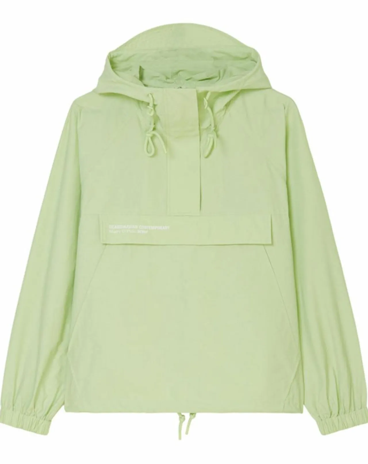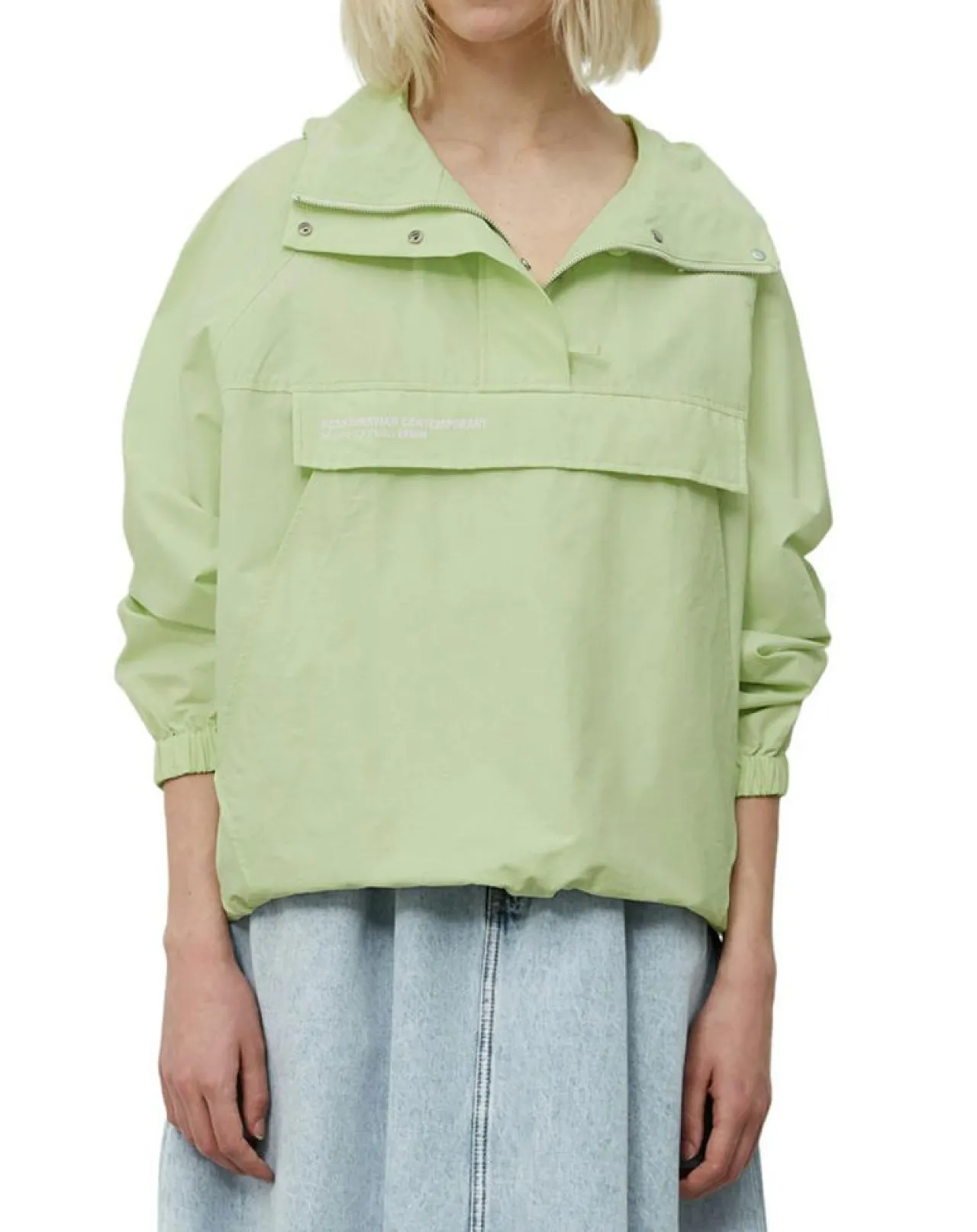 Col droit montant, grande capuche à visière, zip invisible mi-longueur sur le devant et manches raglan sportives à bordure élastique.