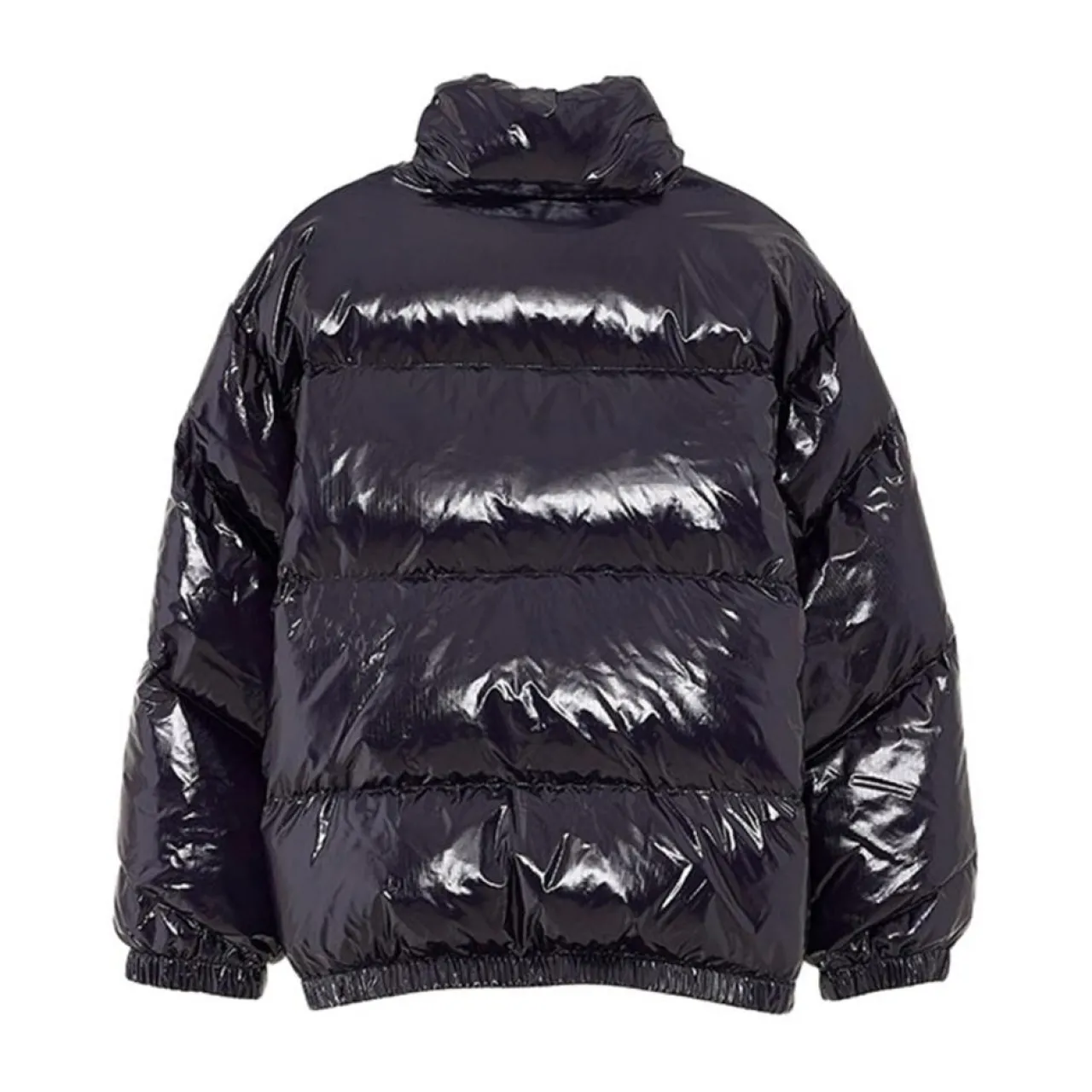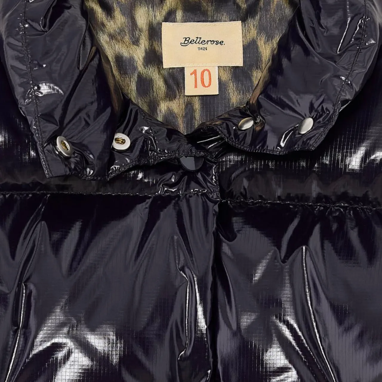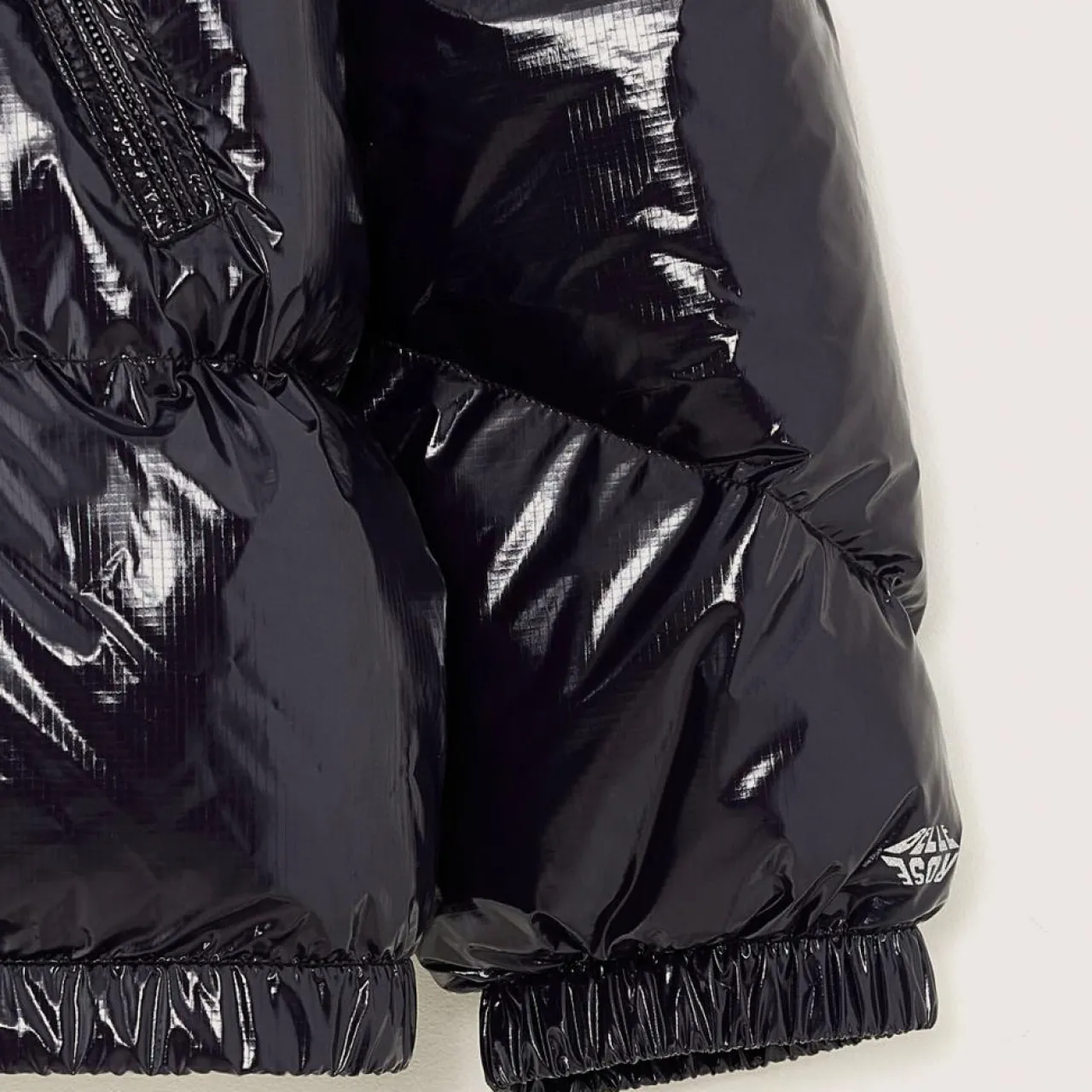Doudoune bleue avec zip avant et boutons-pression dans le bas permettant d’ajuster la longueur d’une coupe classique à une coupe courte
