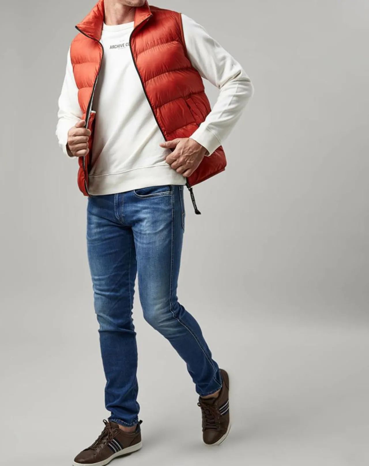 Gilet matelassé ultra-léger, à la surface en nylon hydrofuge, à col droit et zip facile d’utilisation.