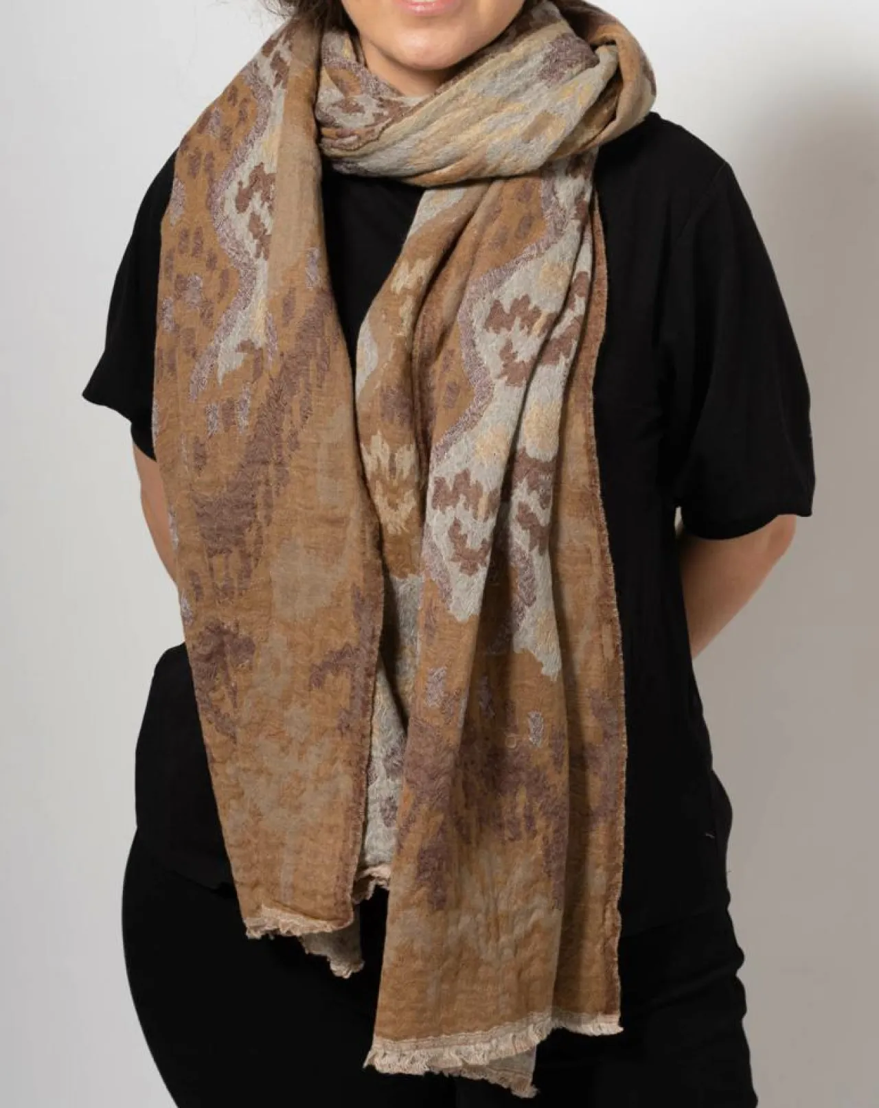 Belle épaisseur pour cette grande étole chaude tissée aux beaux motifs d’Ikat