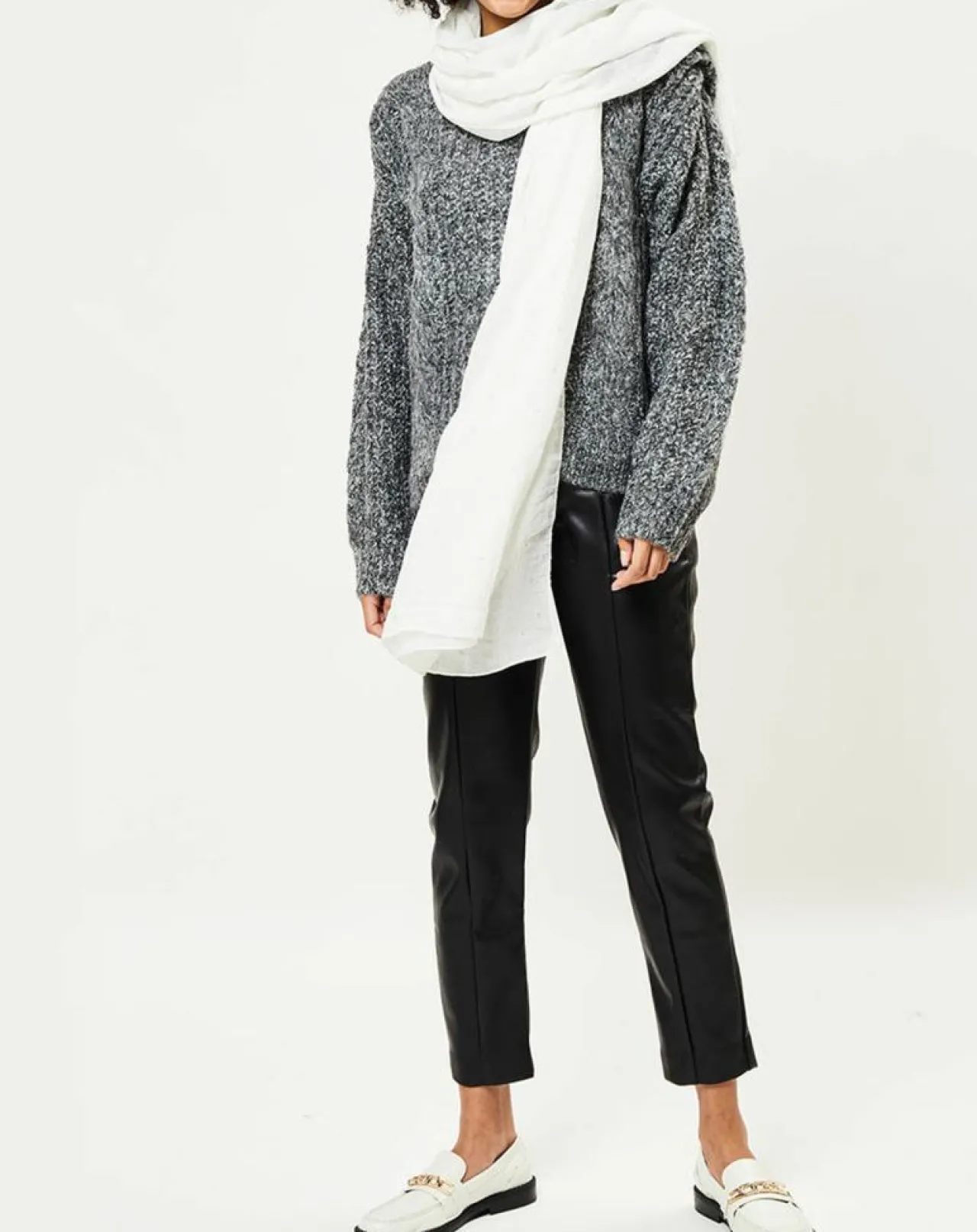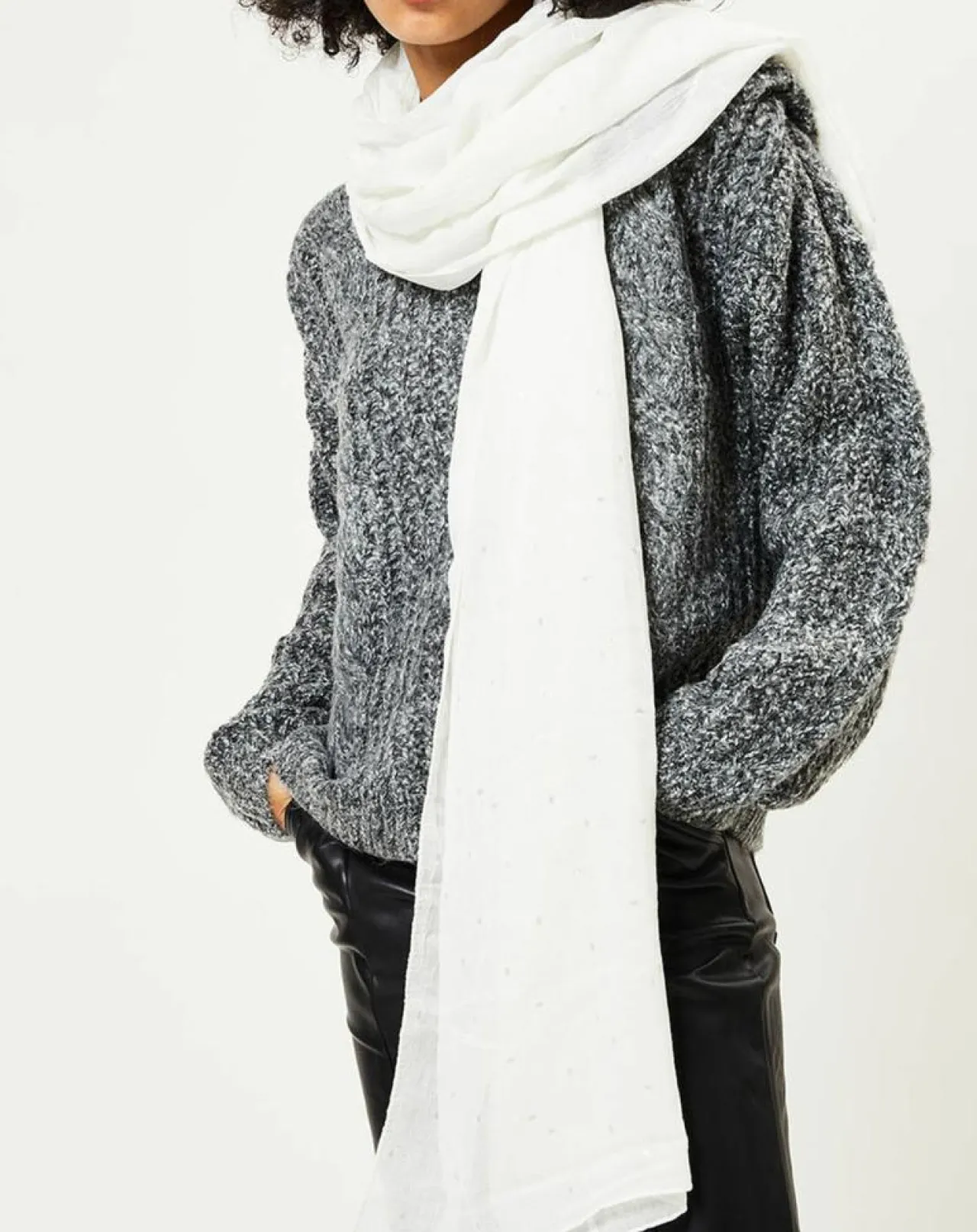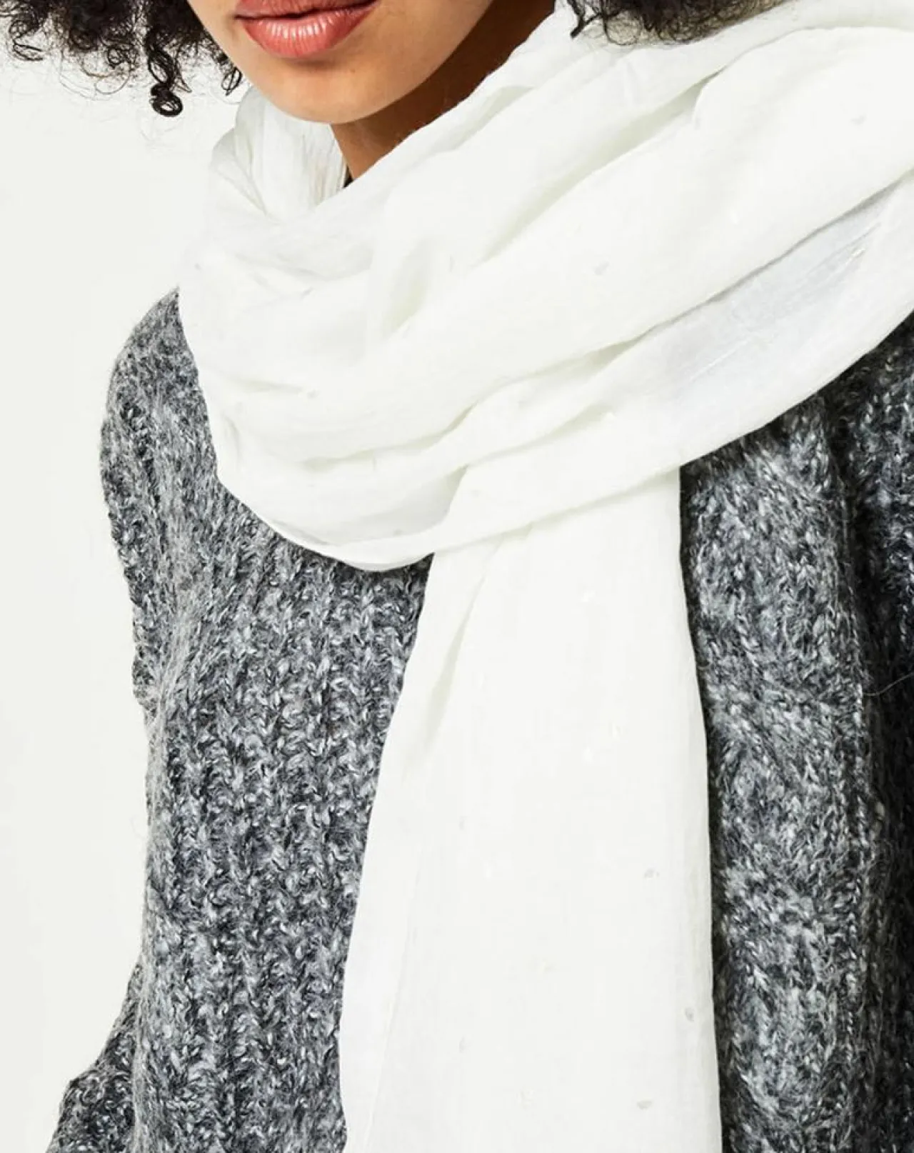 Cette étole Galeries Lafayette en matière synthétique présente des pastilles métallisées all over.