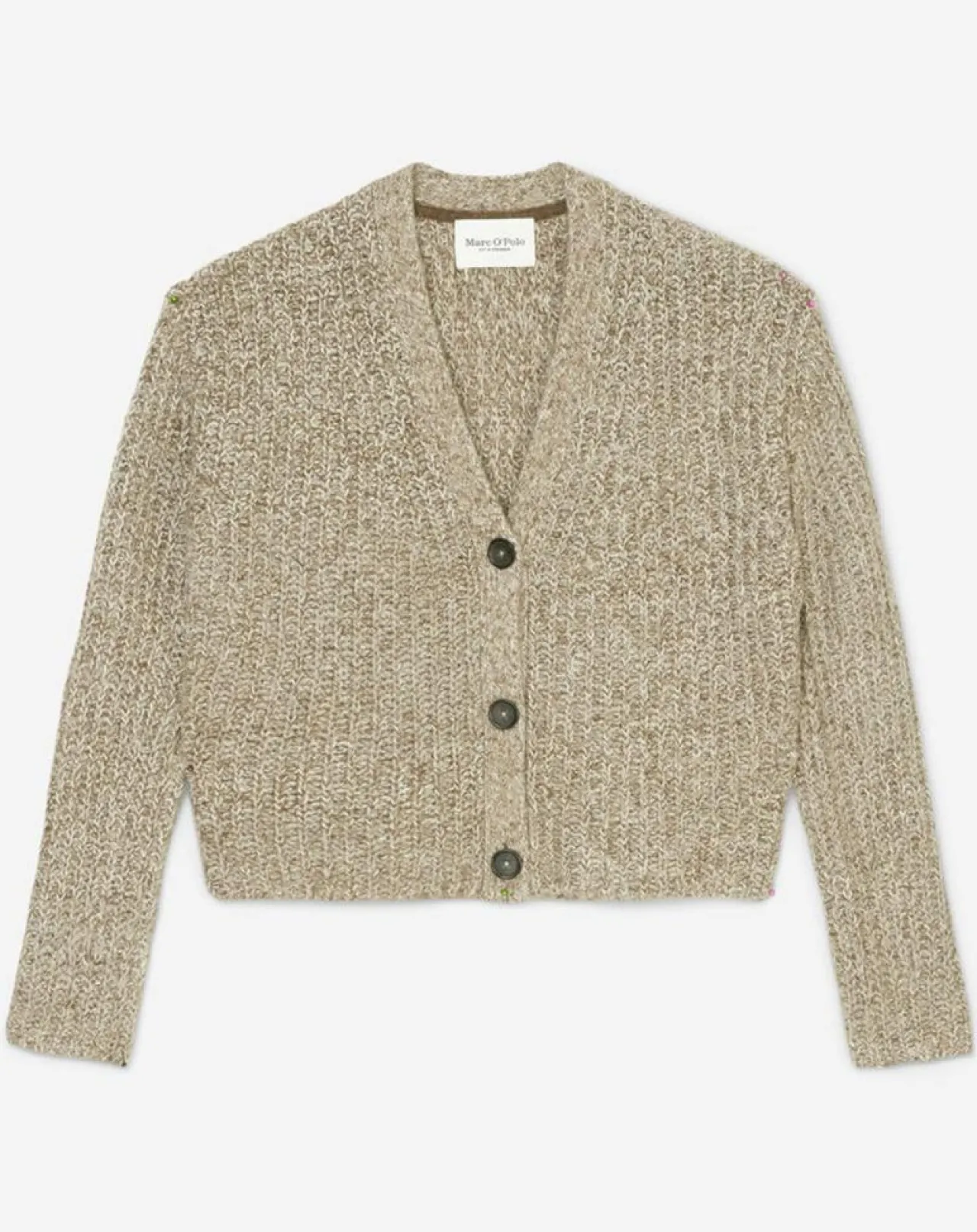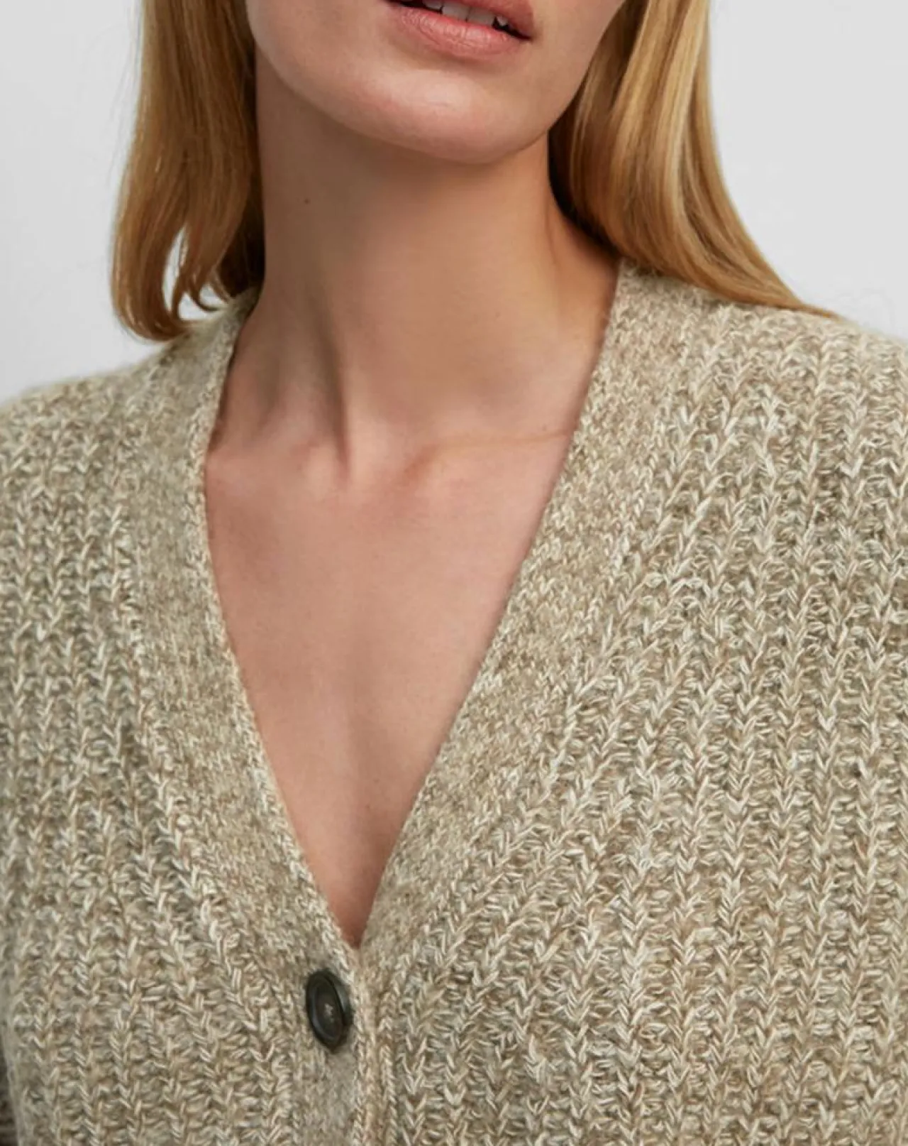 Allure scandinave nonchalante : le cardigan douillet à encolure en V, en fil mouliné multicolore.