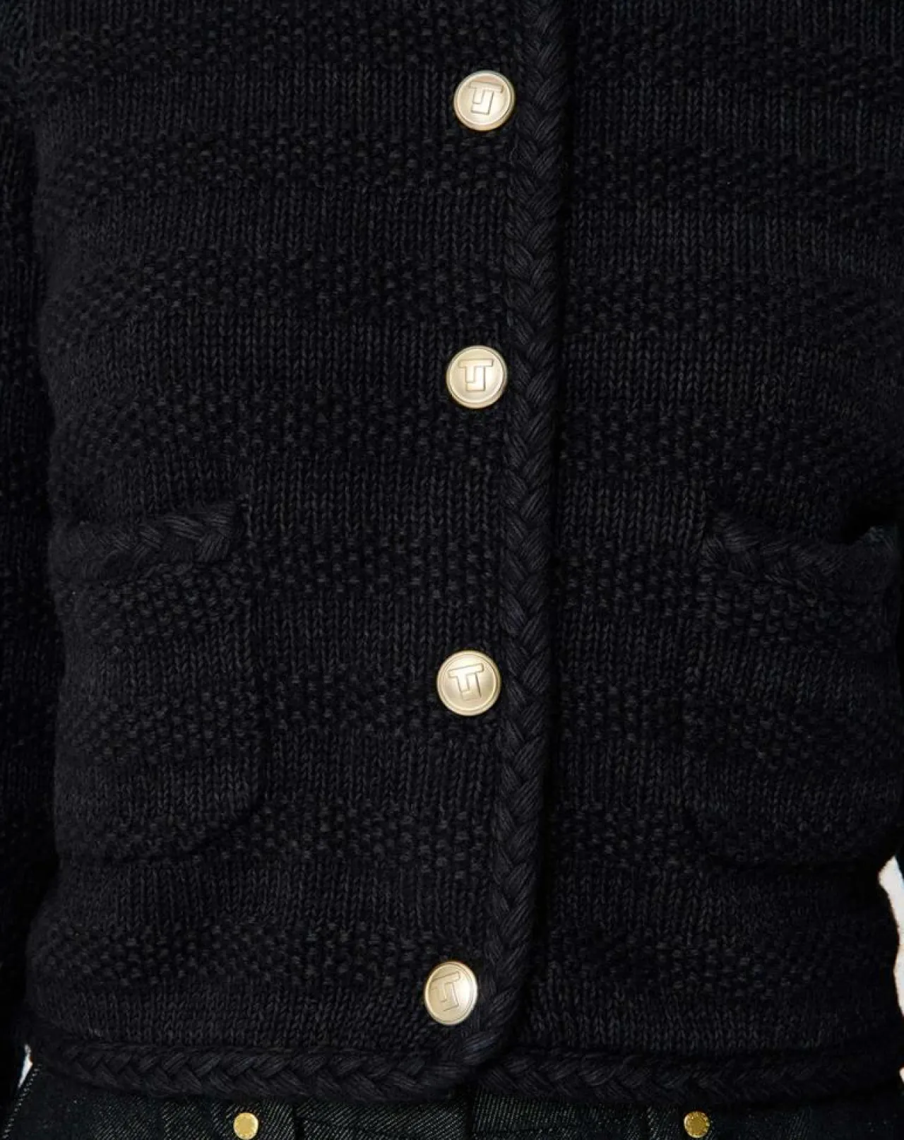 Ce gilet bleu nuit en laine et coton possède des manches longues, une encolure ronde et des poches au-devant