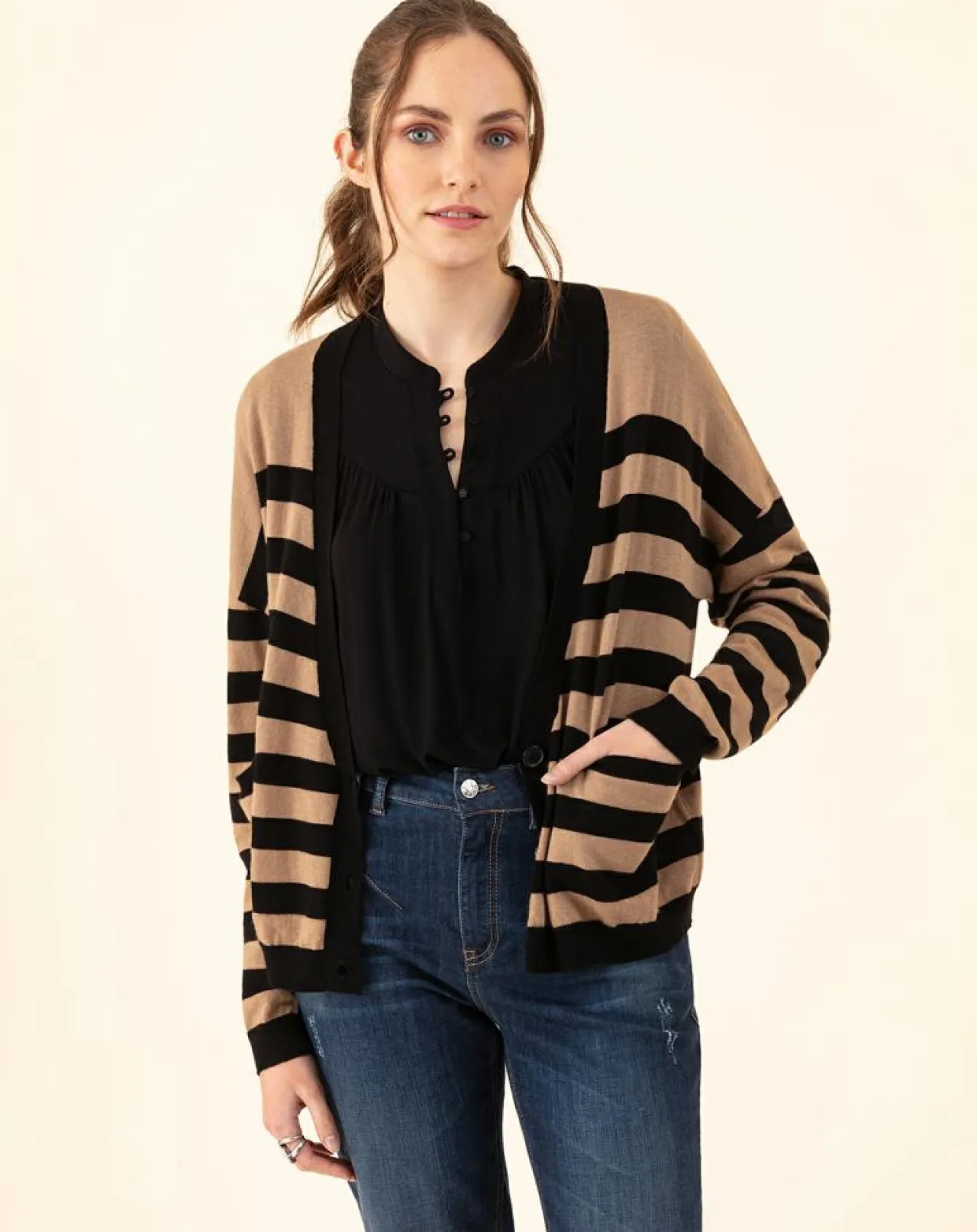 Mettez en avant votre sens du style avec le gilet fin lena rayé noir et camel