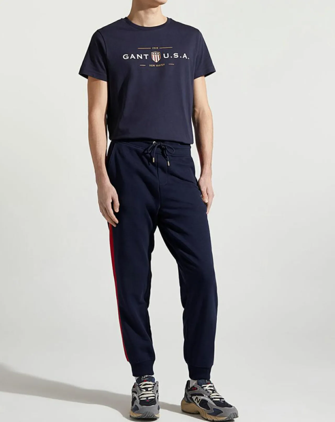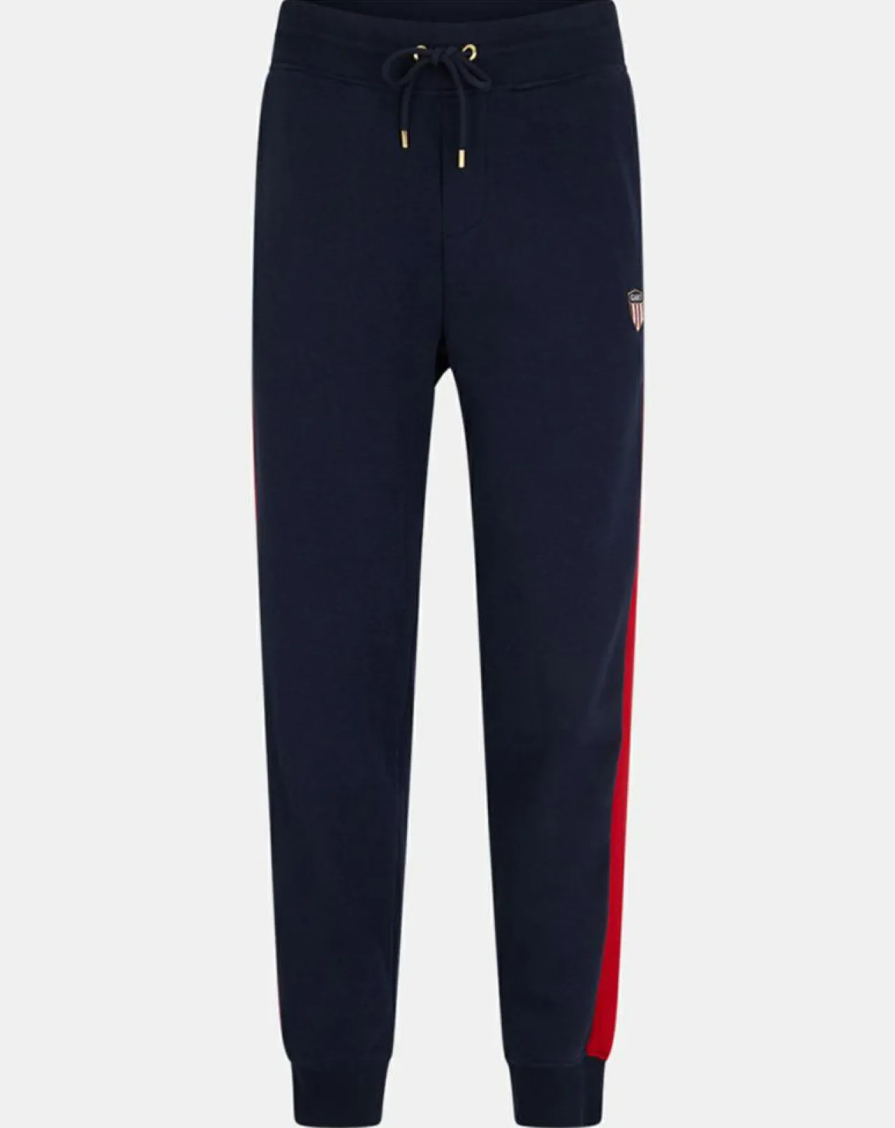 Ce jogging ajusté Gant composé de coton présente une taille élastiquée agrémentée de cordons de serrage, 2 poches italiennes, 1 poche plate, le logo brodé sur l’avant, des bandes contrastantes sur les côtés ainsi que des chevilles resserrées