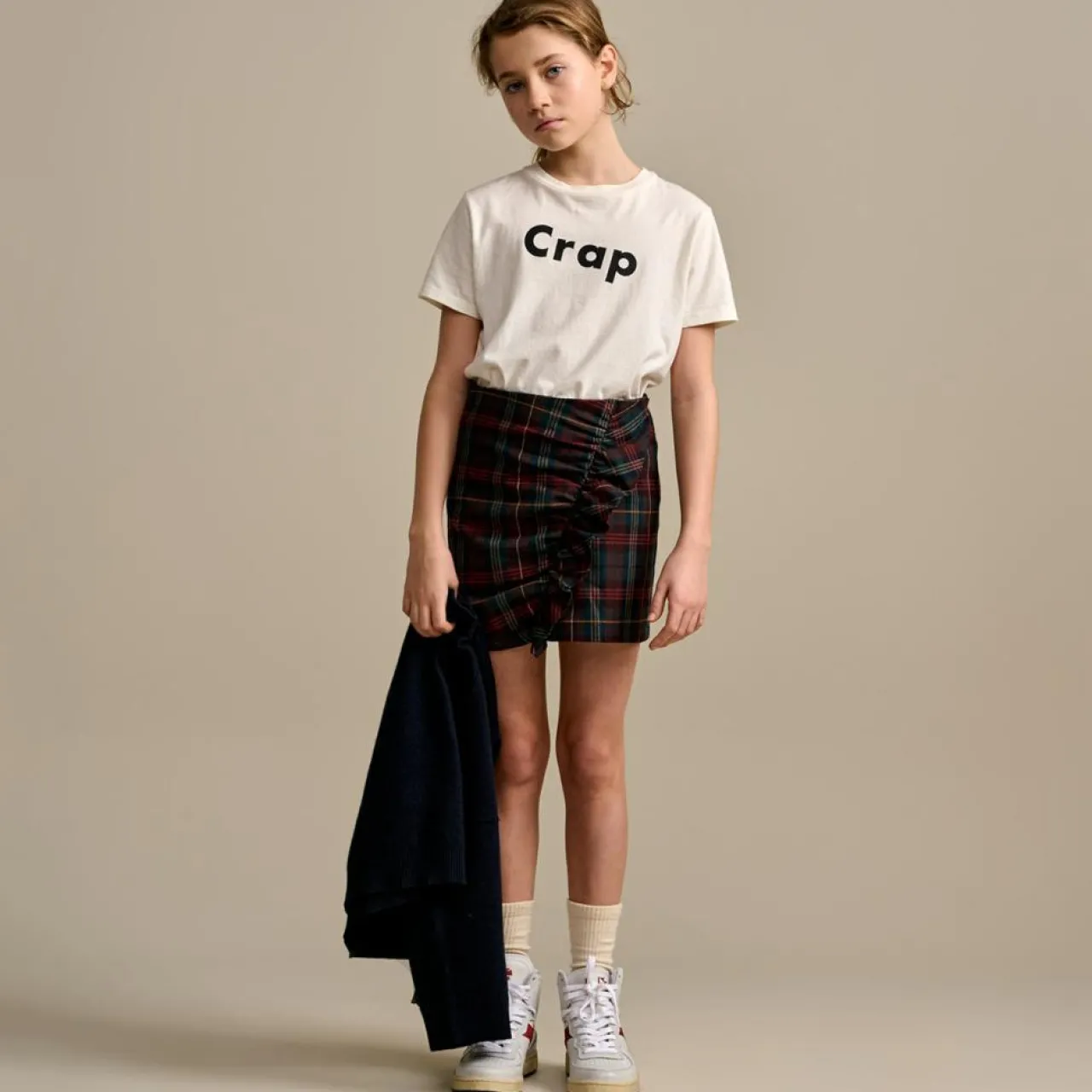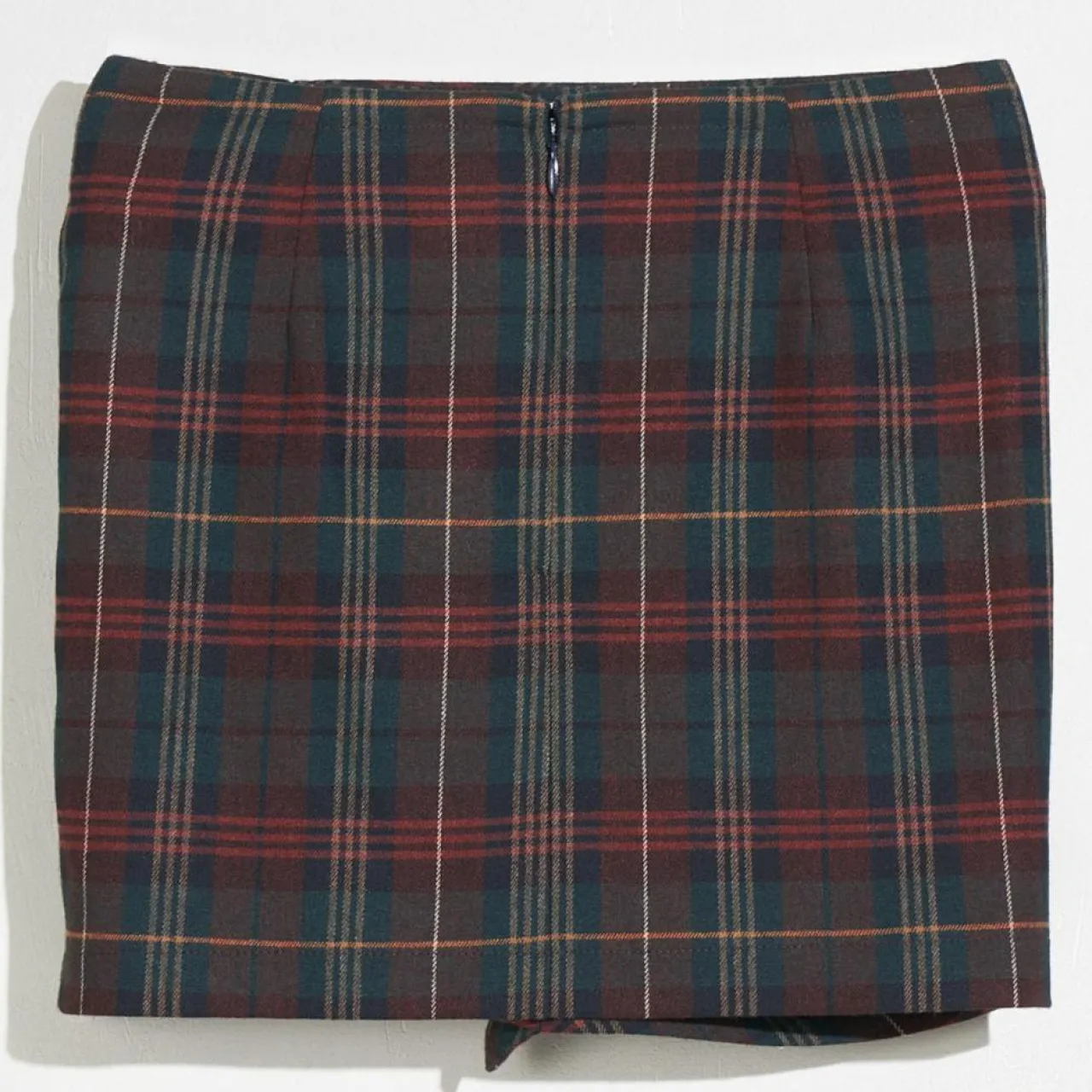Confectionnée dans un mélange de viscose et imprimée de carreaux vintages, cette mini-jupe est ajustée à la taille et présente un volant sur le devant