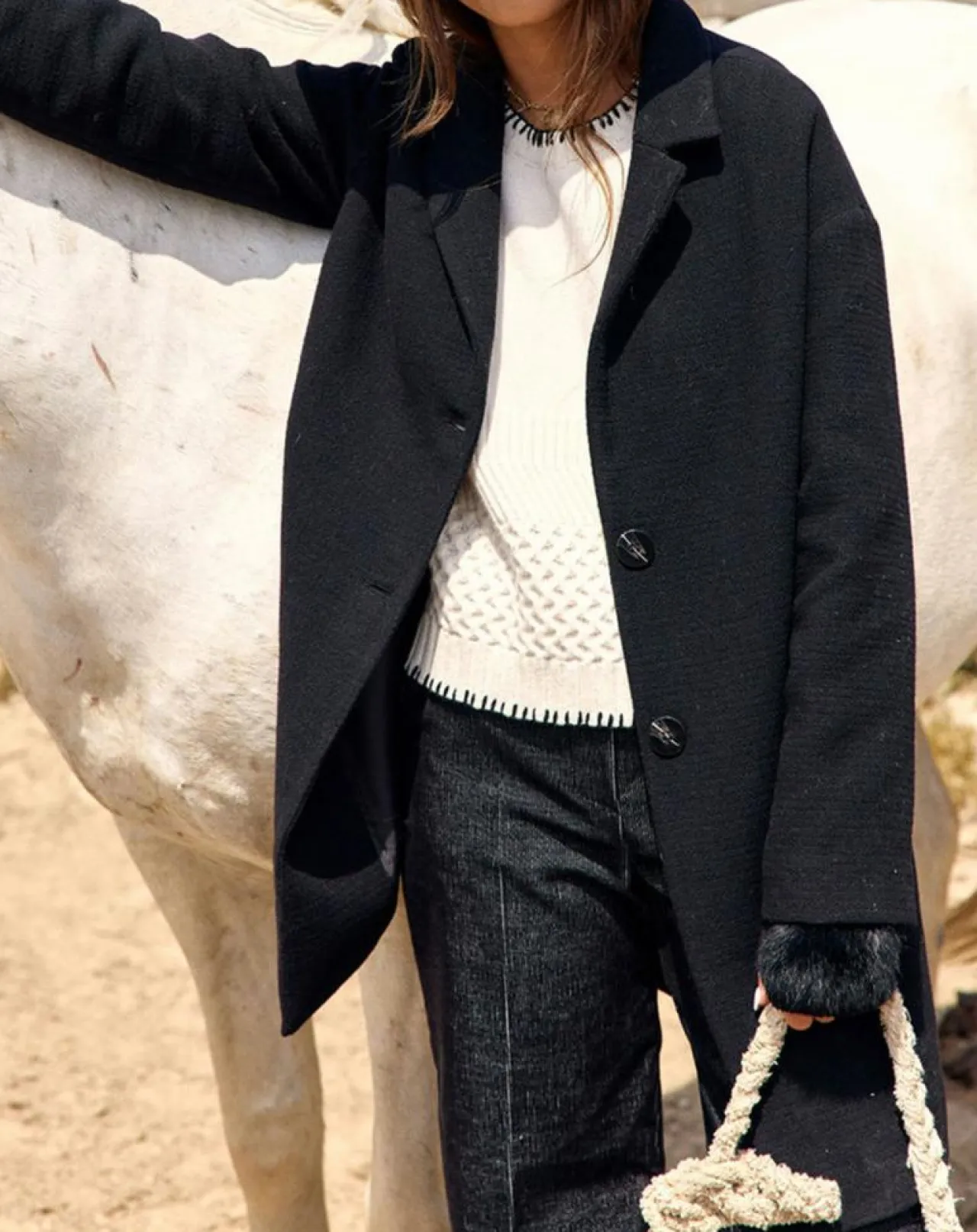Notre modèle porte le manteau Mirav pour une allure chic et branchée pour vos soirées à venir