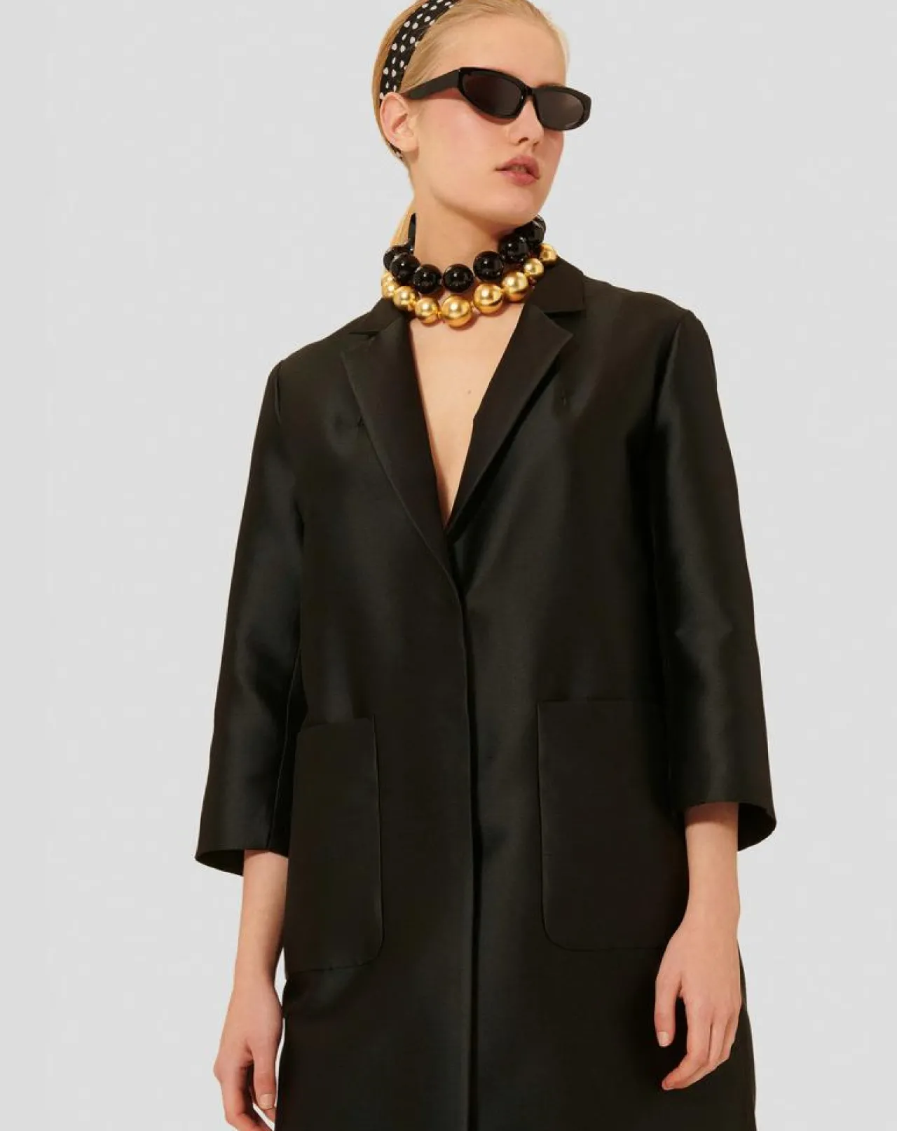 Ce long manteau noir en satin duchesse possède une coupe droite et large, un col à revers, des manches 3/4 et deux grandes poches plaquées aux côtés