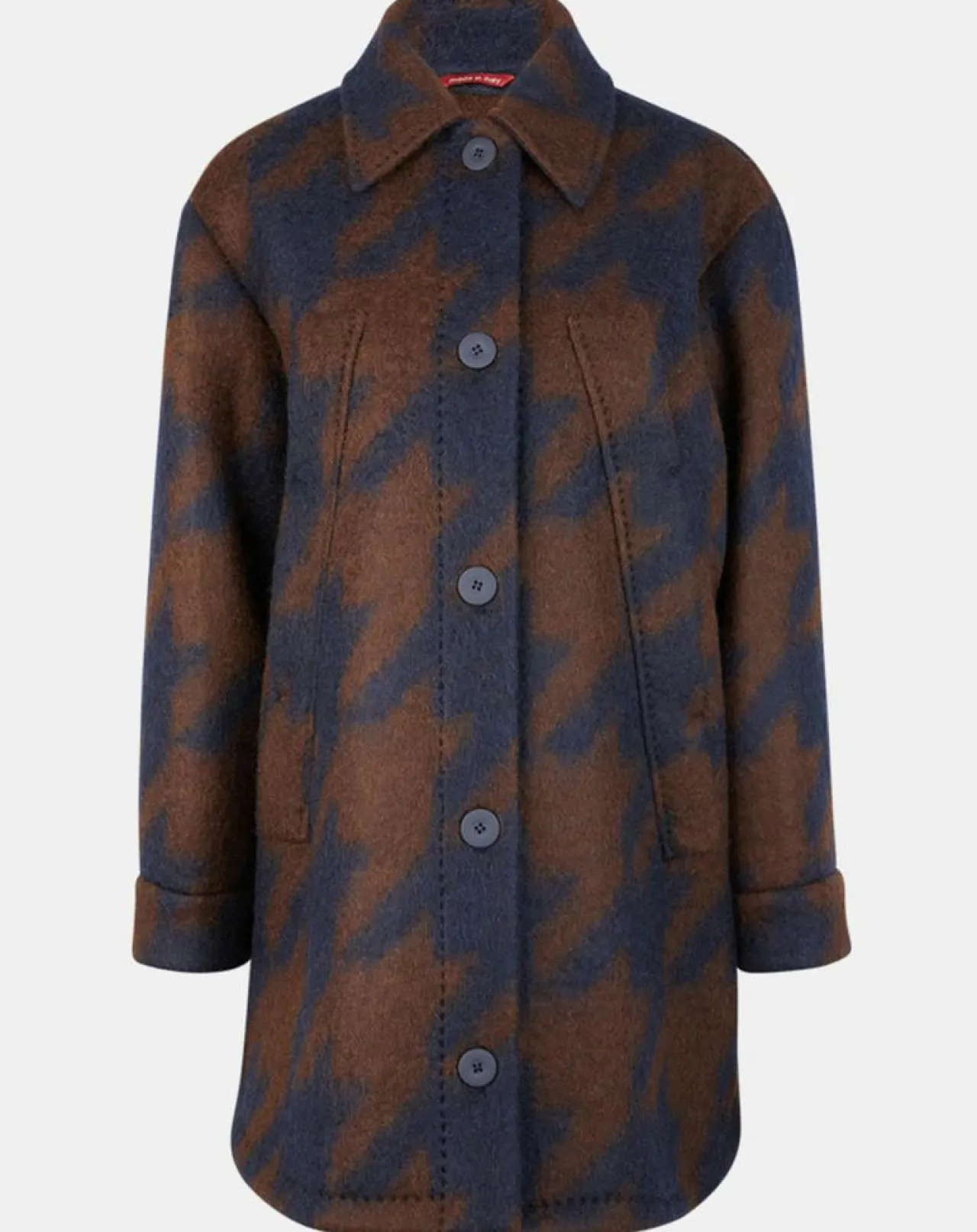 Ce manteau court ample Studio Max Mara composé de laine bouillie à motif fantaisie contrastant all-over, est muni d’un col classique, de manches longues, d’une fermeture boutonnée, de 2 poches en biais sur l’avant et d’une base arrondie fendue.