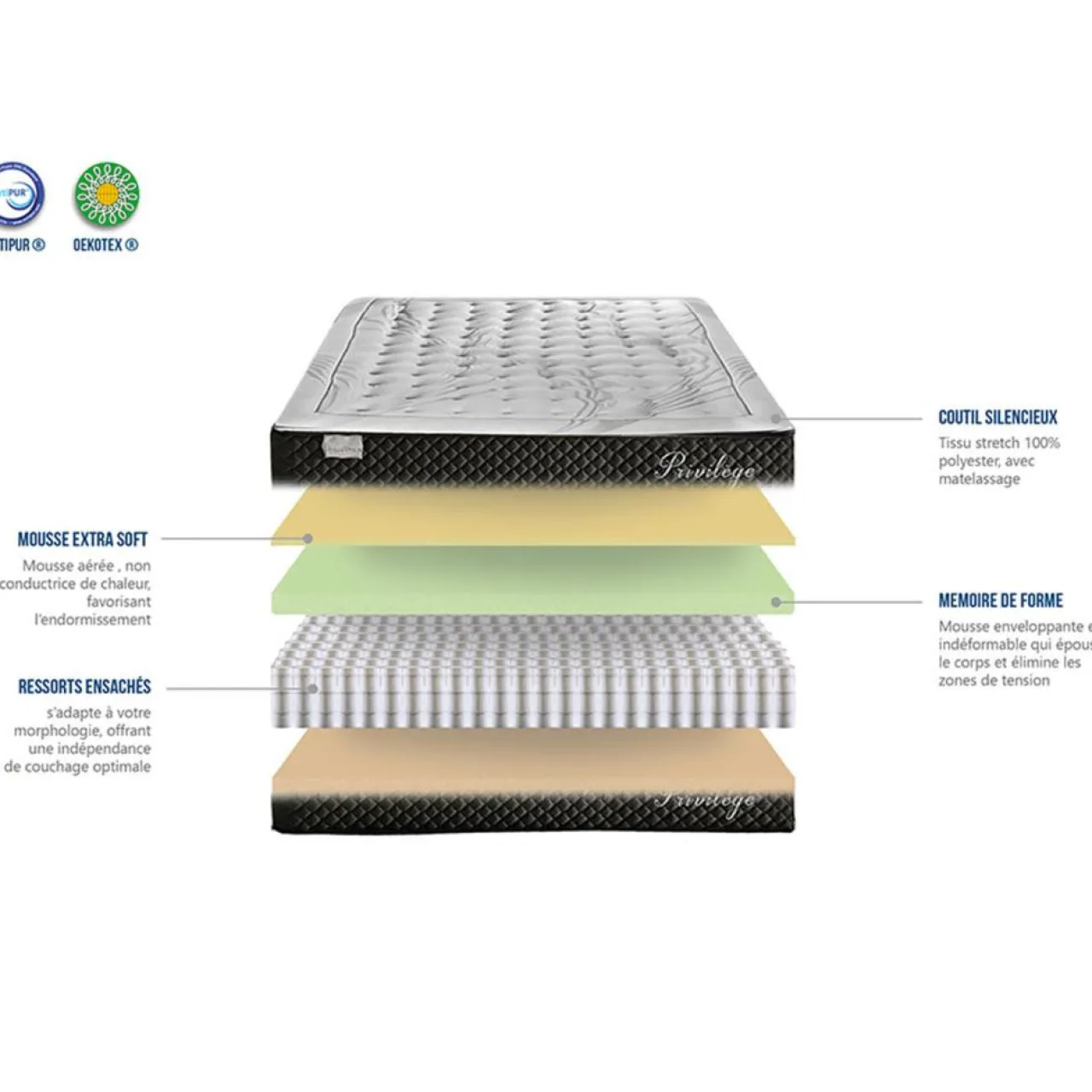 Le matelas Privilège a été conçu dans l’objectif de favoriser le confort de ses utilisateurs. Composé de nombreux ressorts ensachés et d’une généreuse épaisseur de mousse à mémoire de forme, il garantit un sommeil totalement réparateur. Grâce à sa belle fermeté, votre colonne vertébrale sera parfaitement maintenue et donc vos problèmes de dos atténués. Le matelas Privilège est doté d’une épaisseur de 30 cm. Vous dormirez chez vous comme dans un hôtel 5 étoiles !