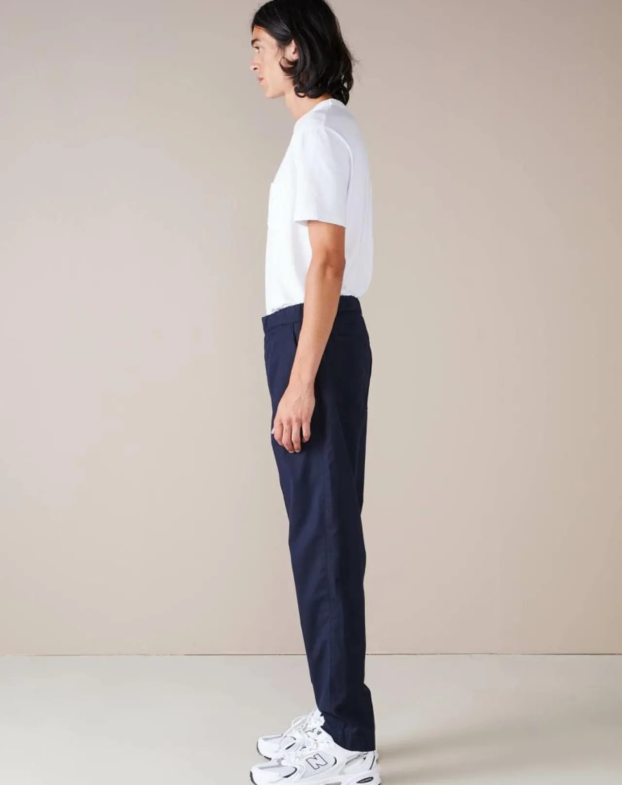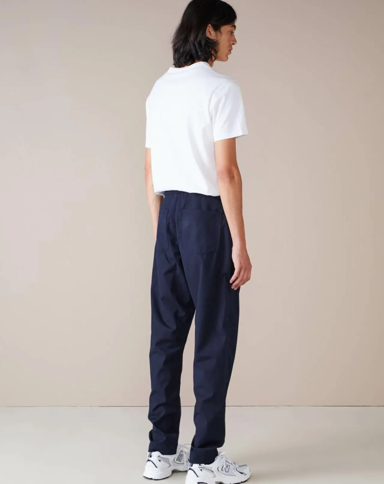 Ce pantalon ample présente une coupe décontractée, avec une taille plus haute, des jambes fuselées et un cordon de serrage à l’intérieur de la ceinture, mais il a l’air plus habillé en raison du tissu en coton/laine lisse utilisé ici