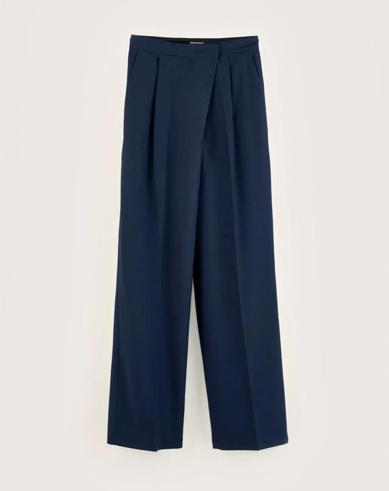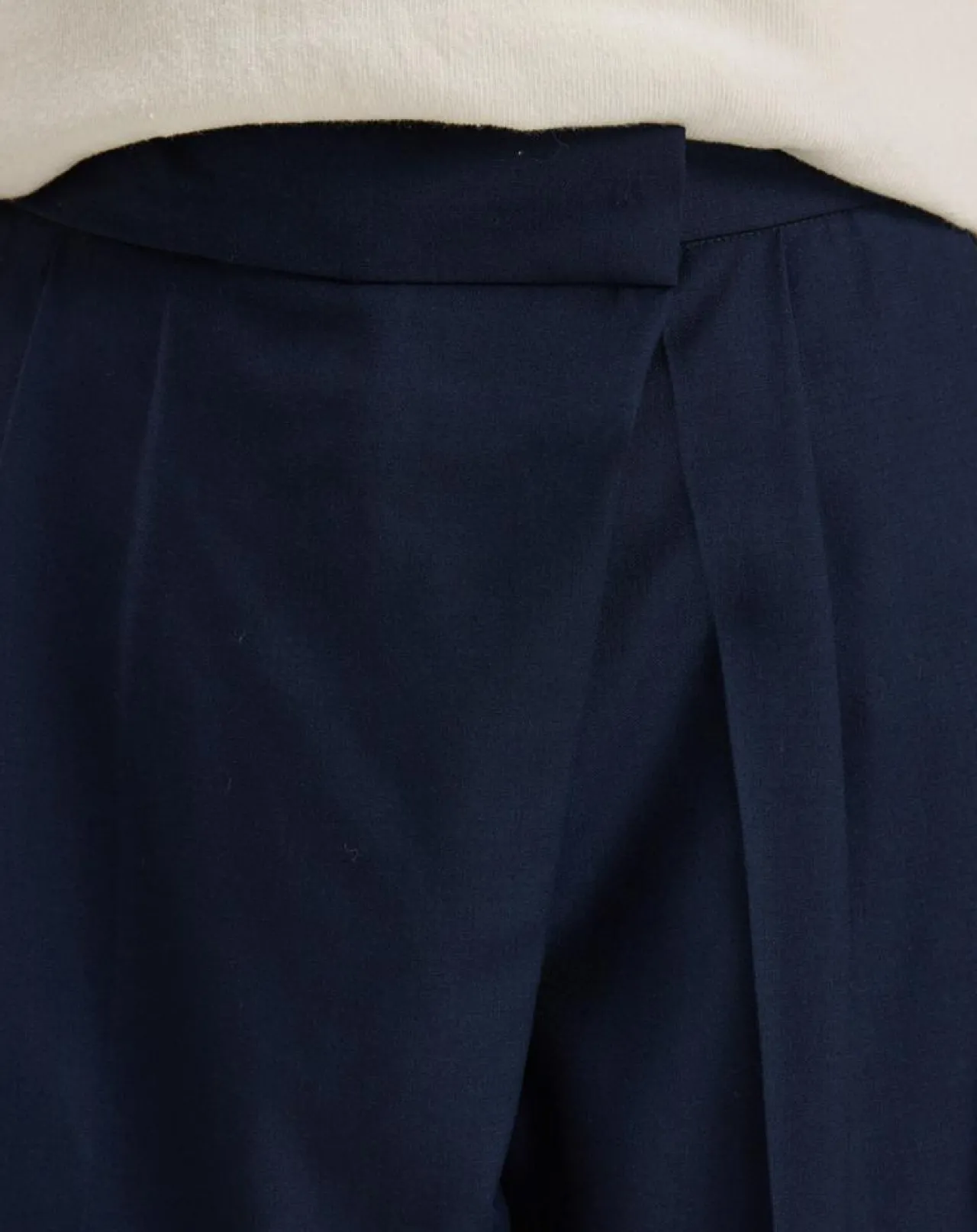Pantalon de tailleur en laine bleu marine, taille haute avec avant drapé et croisé et jambes droites