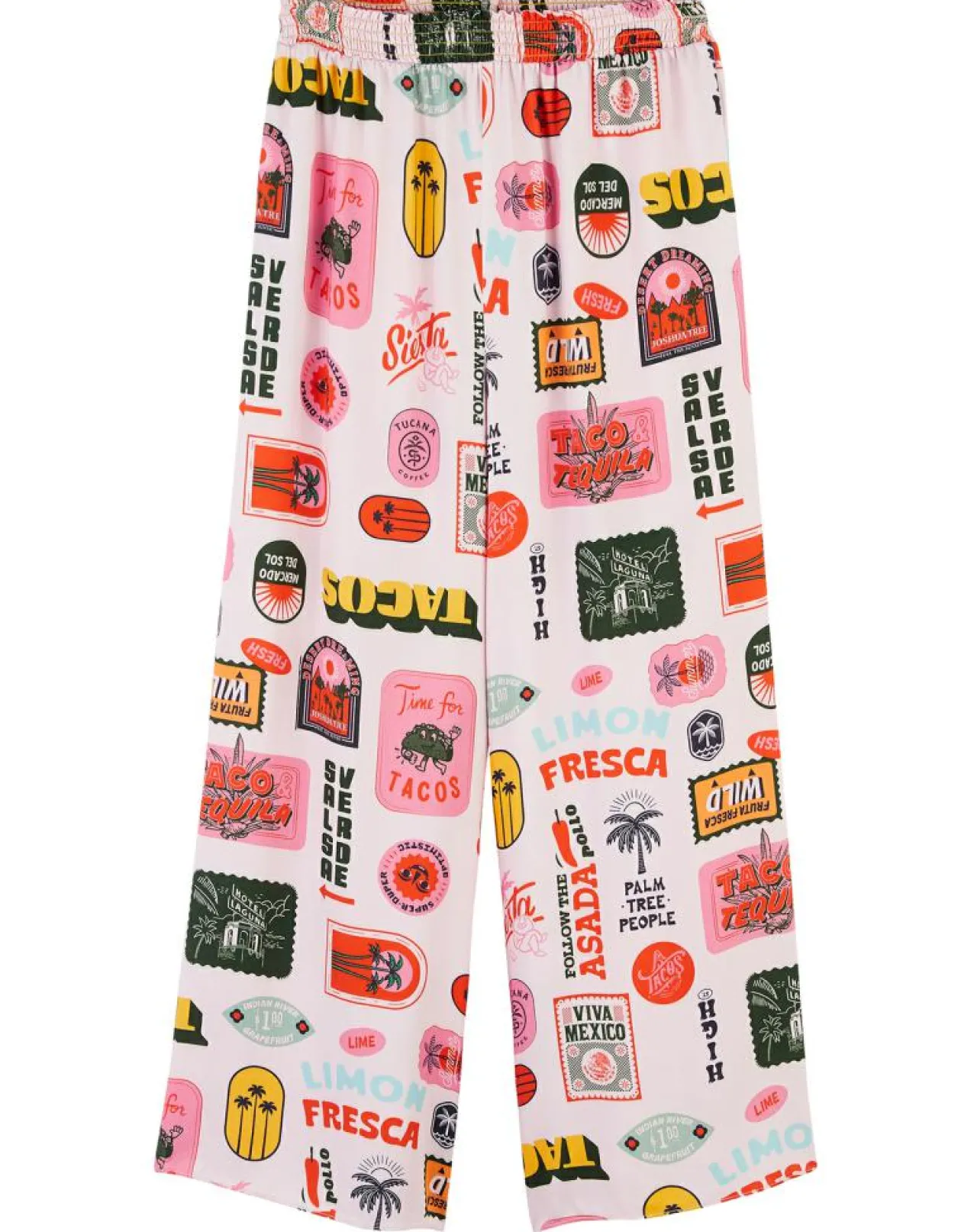Le pantalon parfait pour être confort et lookée à la fois, en viscose satinée imprimée all over Tacos Vanille ou Rose, avec un esprit vintage où l’on peut retrouver des palmiers, des soleils, des petits logos clin d’oeil aux packagings ou restaurants mexicains: »Viva Mexico », »Siesta », »Taco Tequila », pas de doute, nous sommes au Mexique!