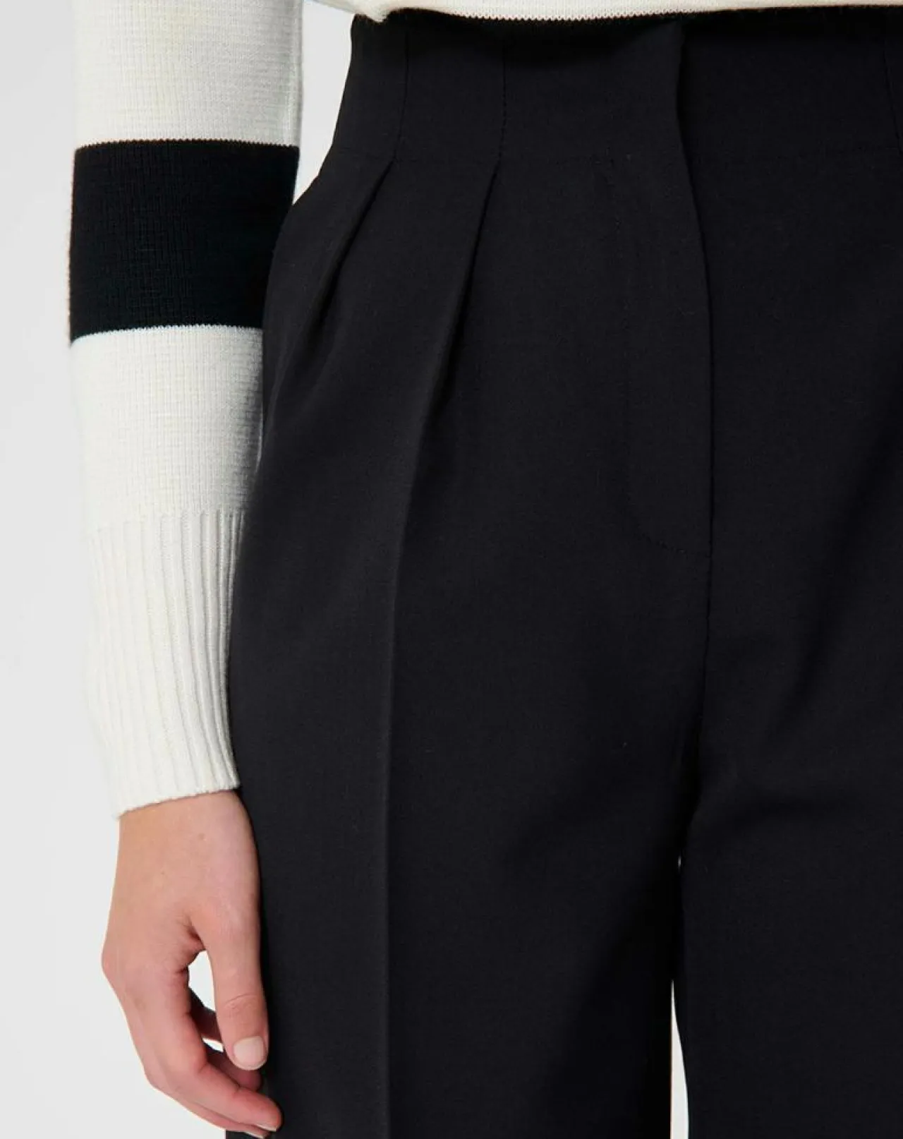 Ce long pantalon en laine noir possède deux poches aux côtés ainsi qu’une poche passepoilée au dos agrémentée d’un petit bouton ton sur ton