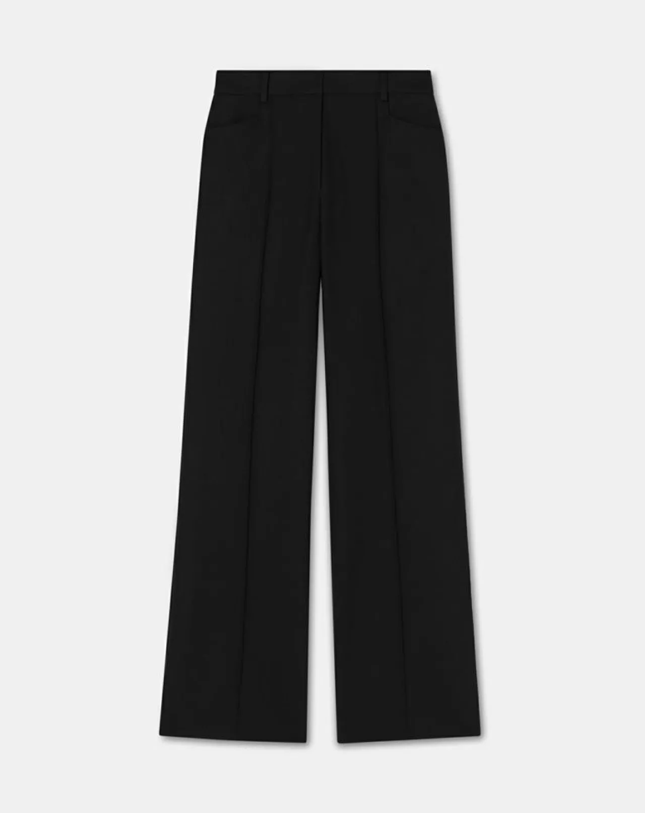 Ce pantalon de tailleur noir a une taille haute et une coupe droite légèrement évasée en bas