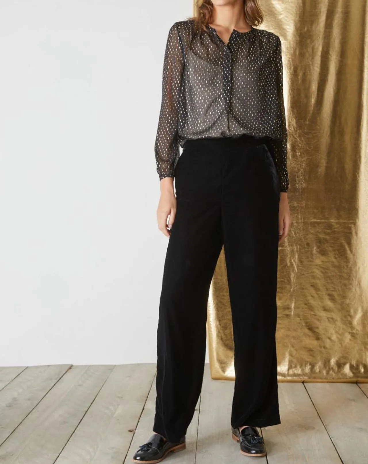 En mode velours, le pantalon large renouvelle le vestiaire raffiné et festif