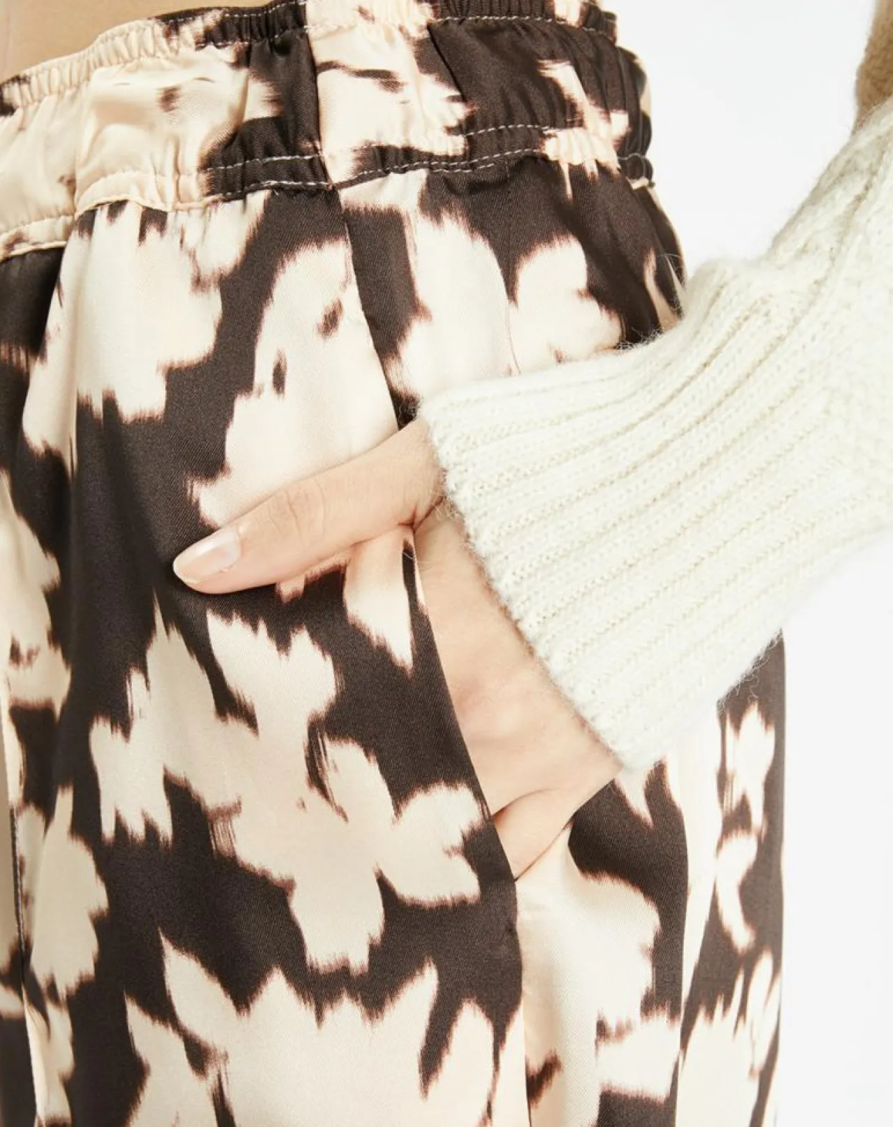 On adopte cette direction en optant pour un tissu fluide et large orné d’un imprimé beige et chocolat
