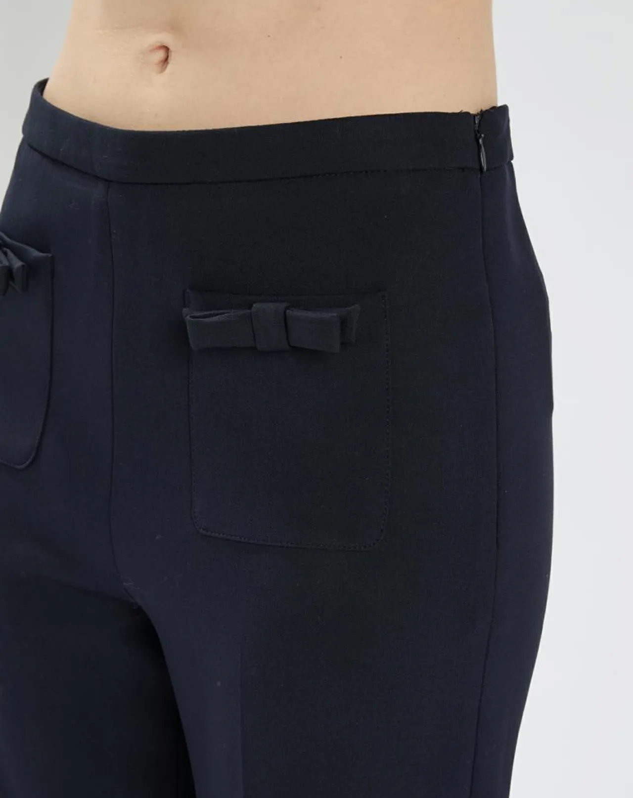 Il possède de petites poches plaquées devant décorée d’un noeud plat ton sur ton et des poches passepoilées à l’arrière