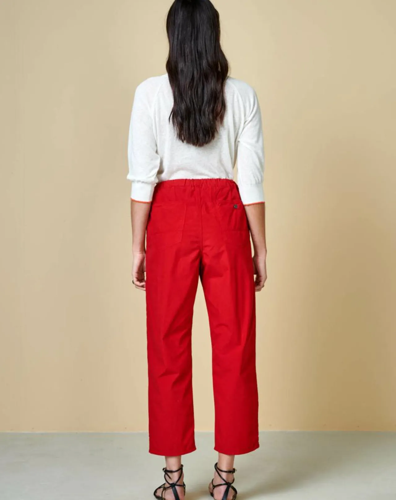Coupe inspirée des pantalons de travail classiques (voir les grandes poches plaquées au dos), puis mise à jour pour obtenir une coupe nonchalante mais féminine