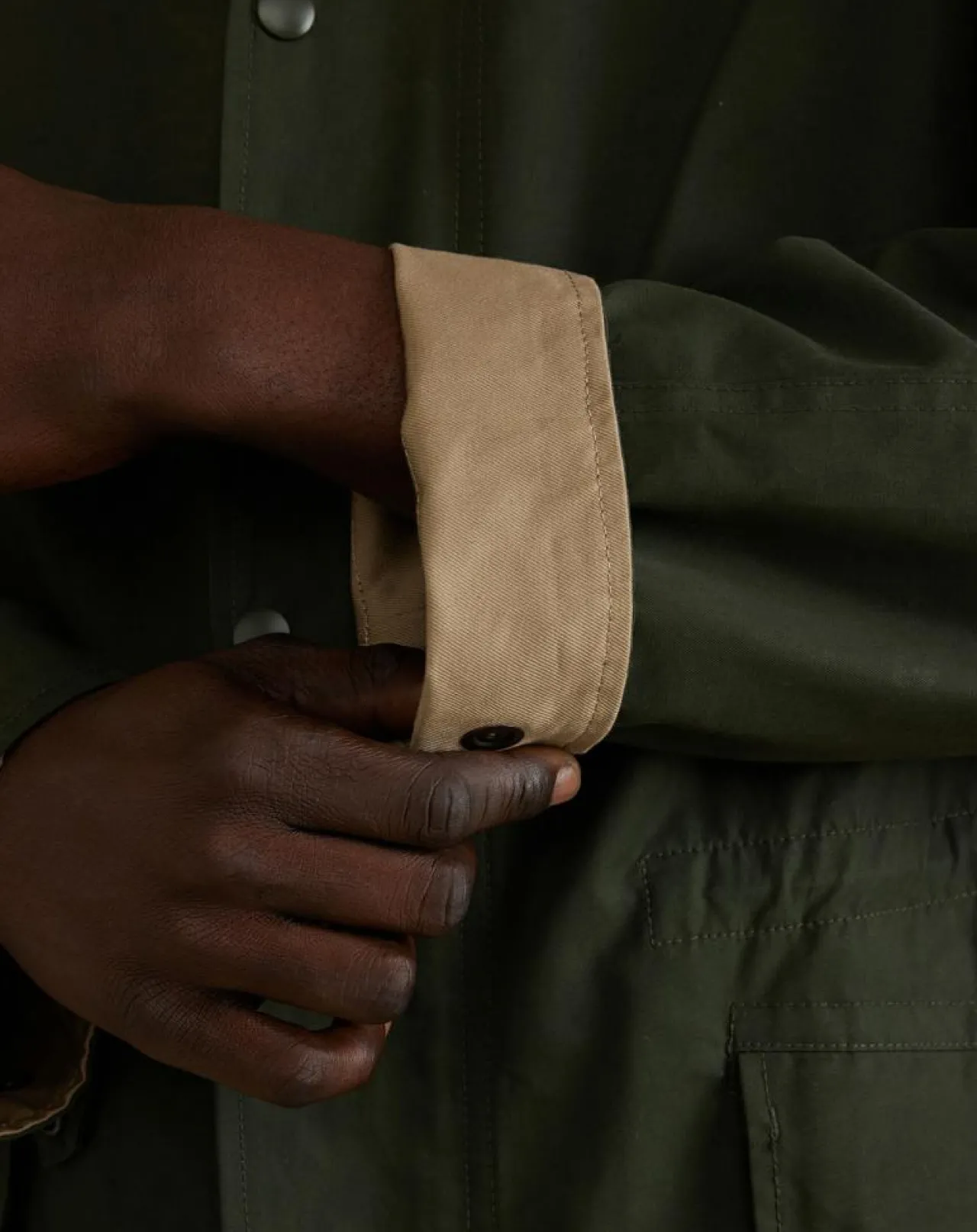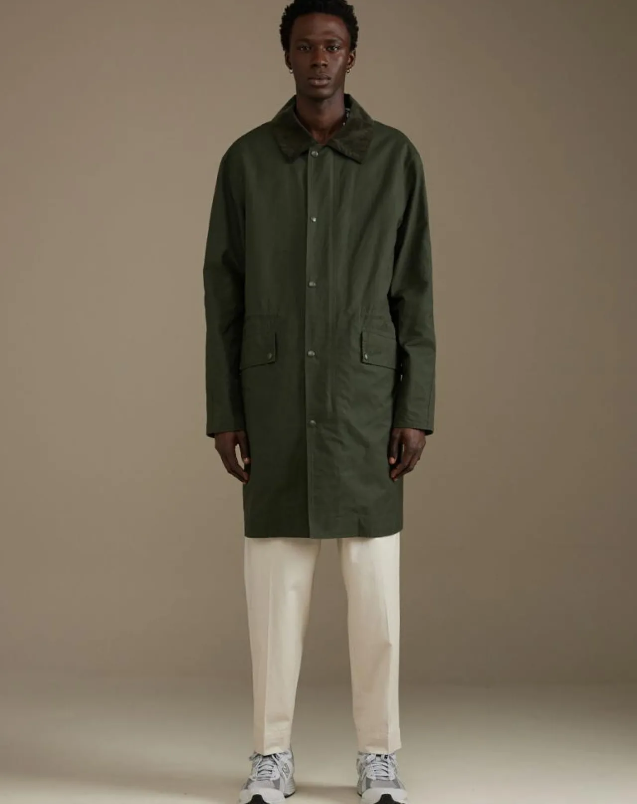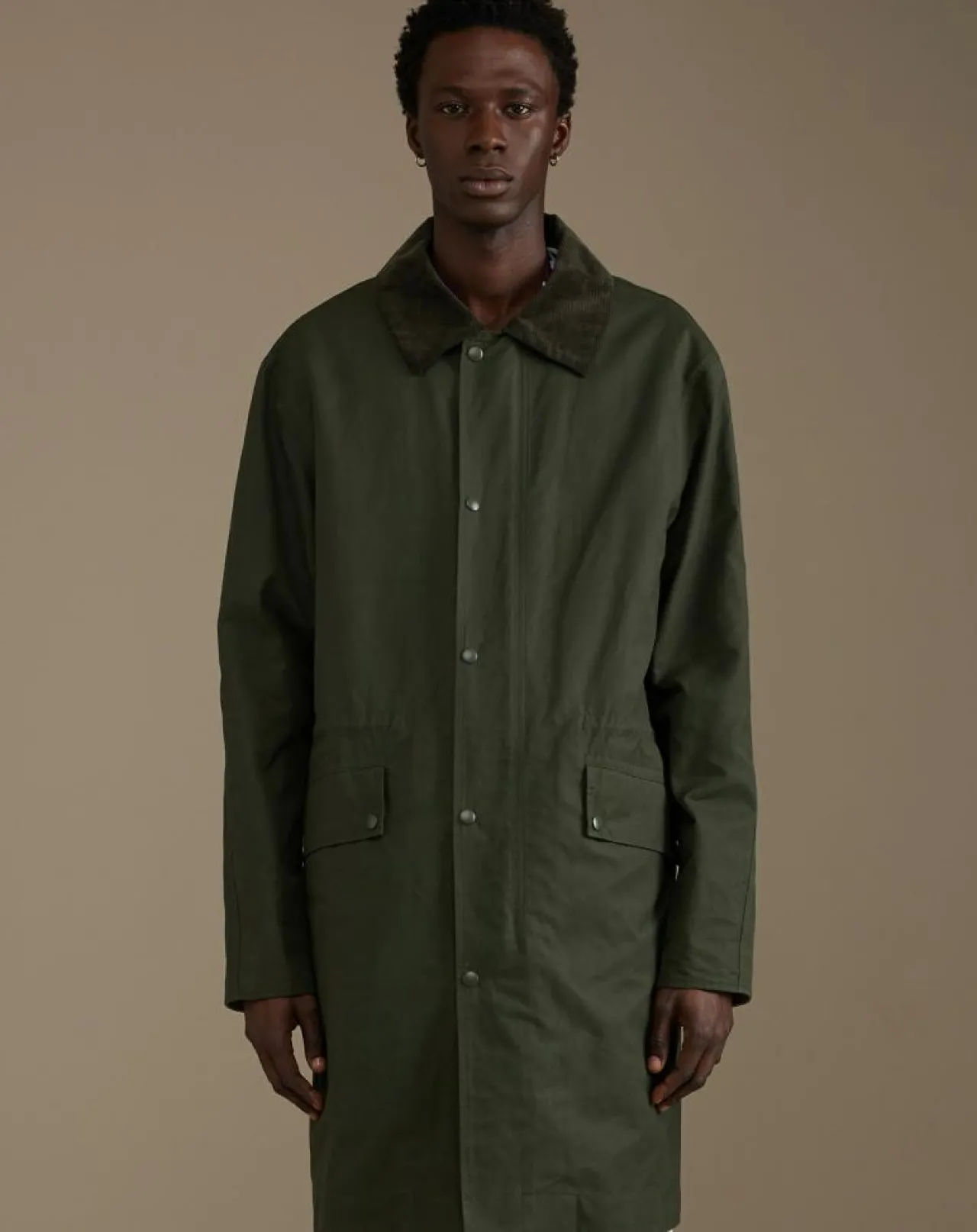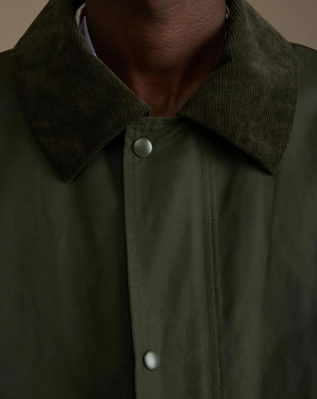 Confectionnée en coton mélangé déperlant, elle présente des détails de velours côtelé sur le col et les poignets, une fermeture par boutons-pression et un cordon de serrage à la taille pour ajuster la coupe