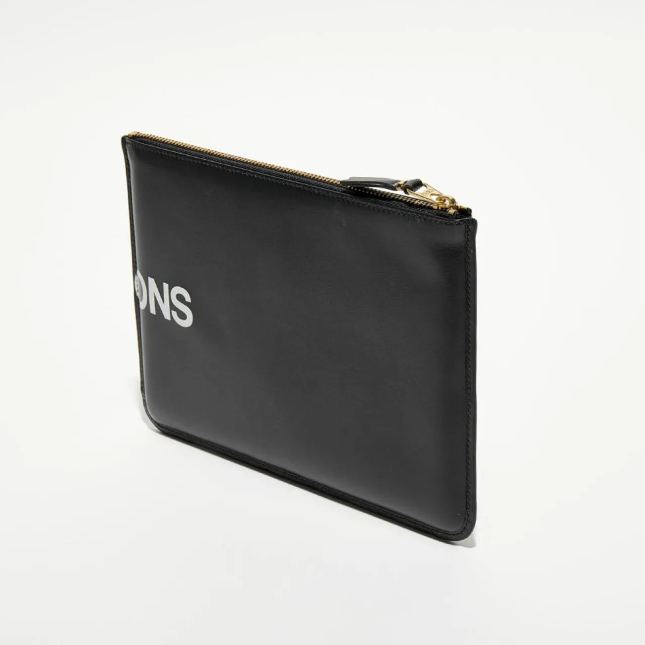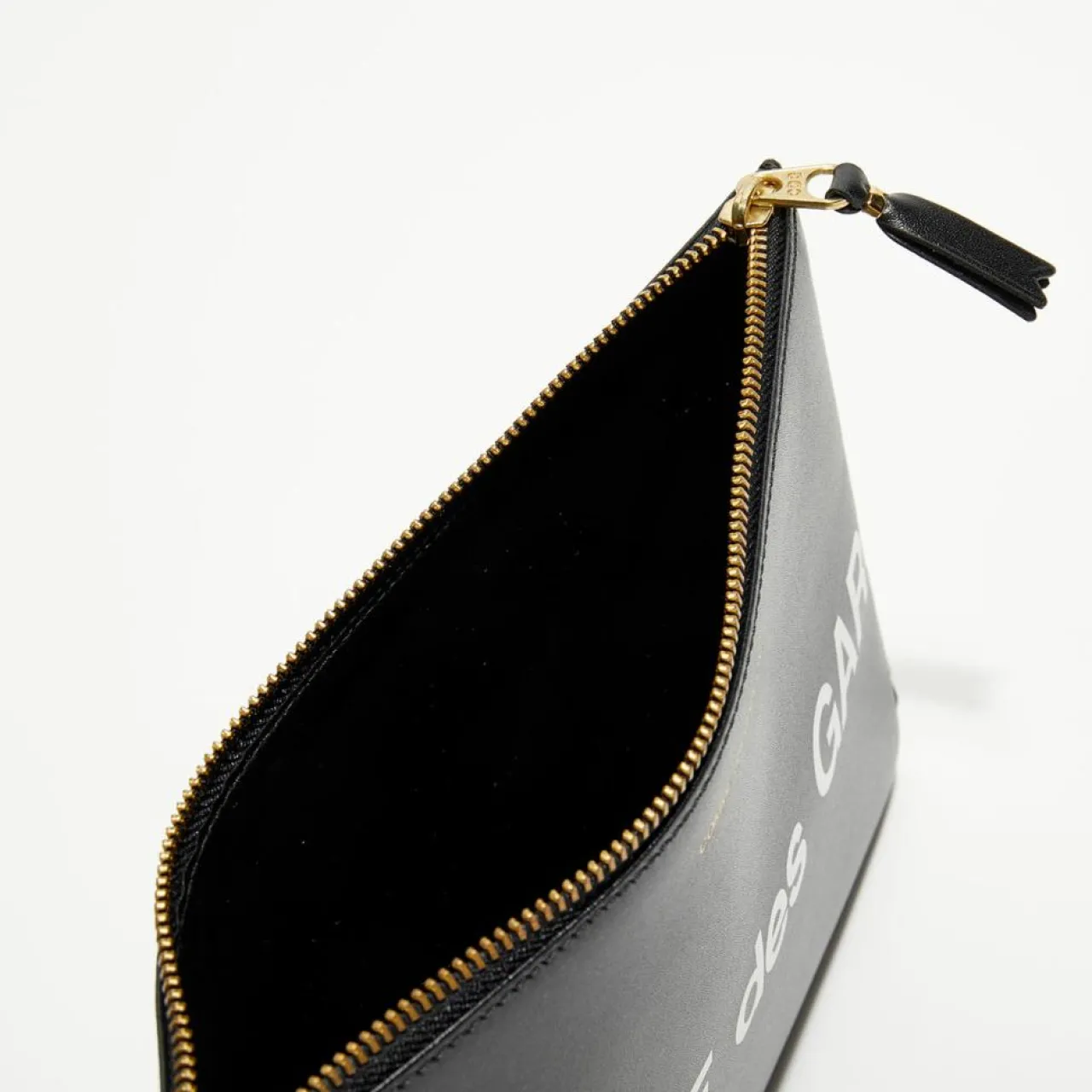 La pochette en cuir lisse Comme des Garçons arbore un logo imprimé contrastant qui s’étend jusqu’au dos et un logo laminé