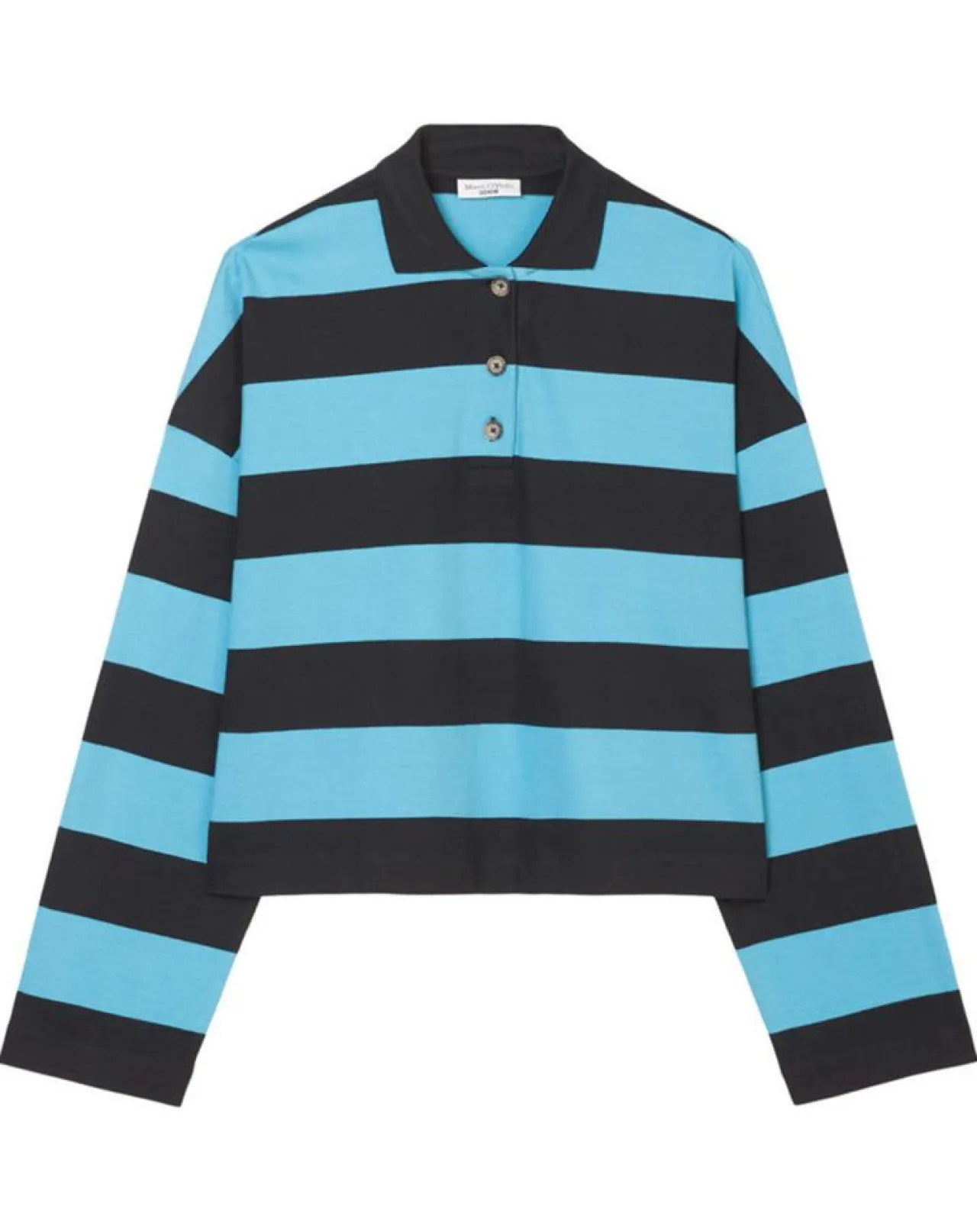 L’incarnation du style universitaire chic des beaux quartiers, revisitée et modernisée : le polo oversize décontracté et raccourci au style preppy à larges rayures.