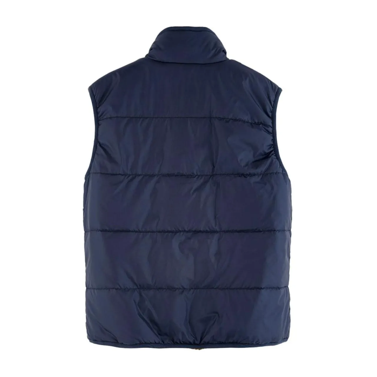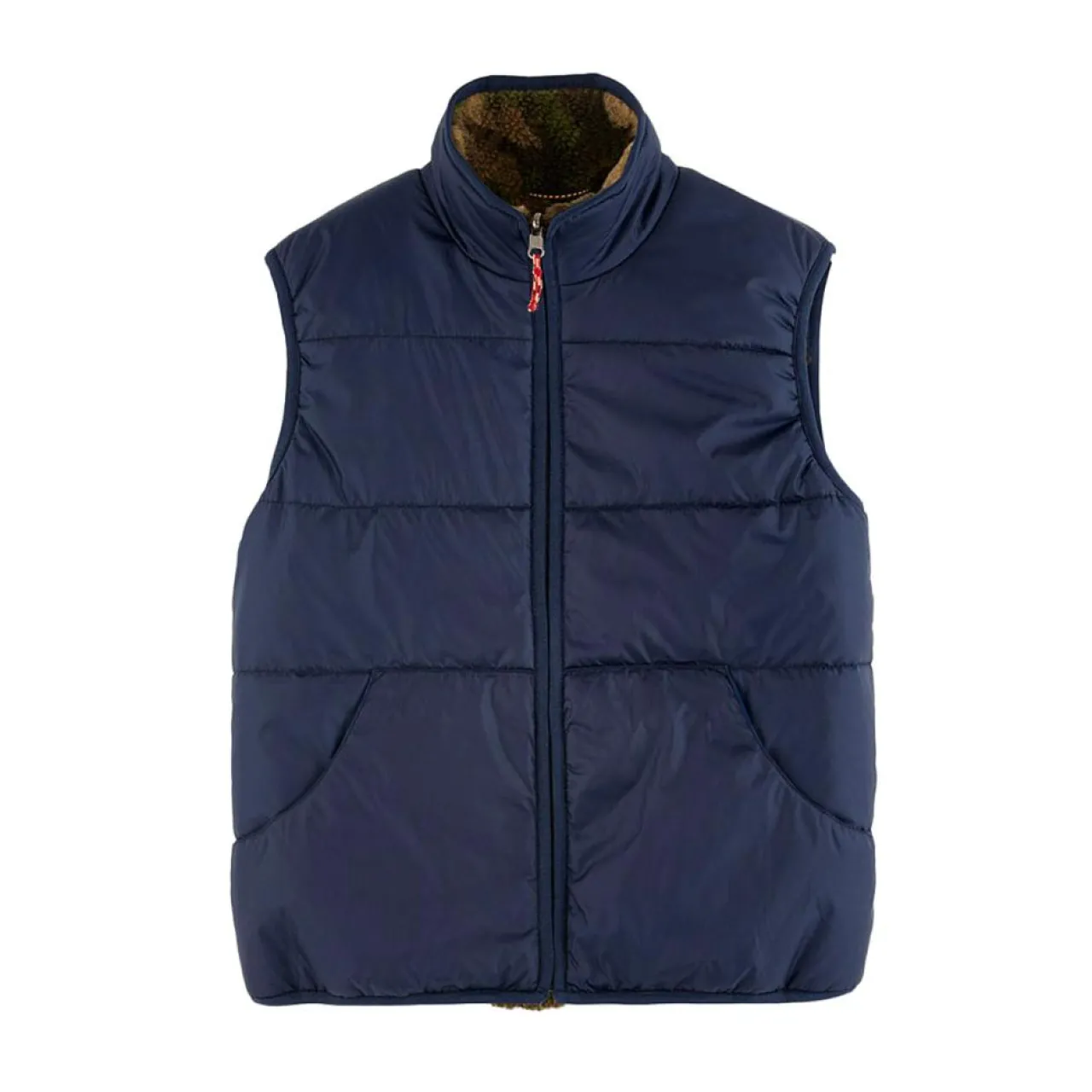 Bodywarmer réversible et genderless avec un côté en teddy imprimé camouflage et l’autre en tissu bleu déperlant