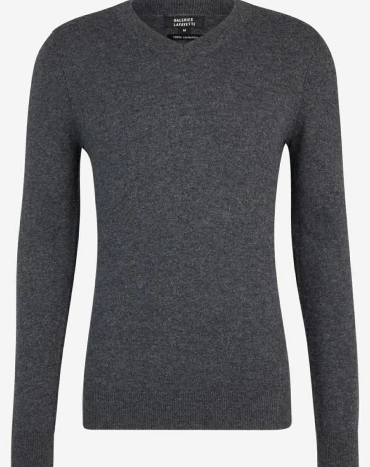 Ce pull droit Galeries Lafayette en cachemire est muni d’un col V, de manches longues et de finitions côtelées.