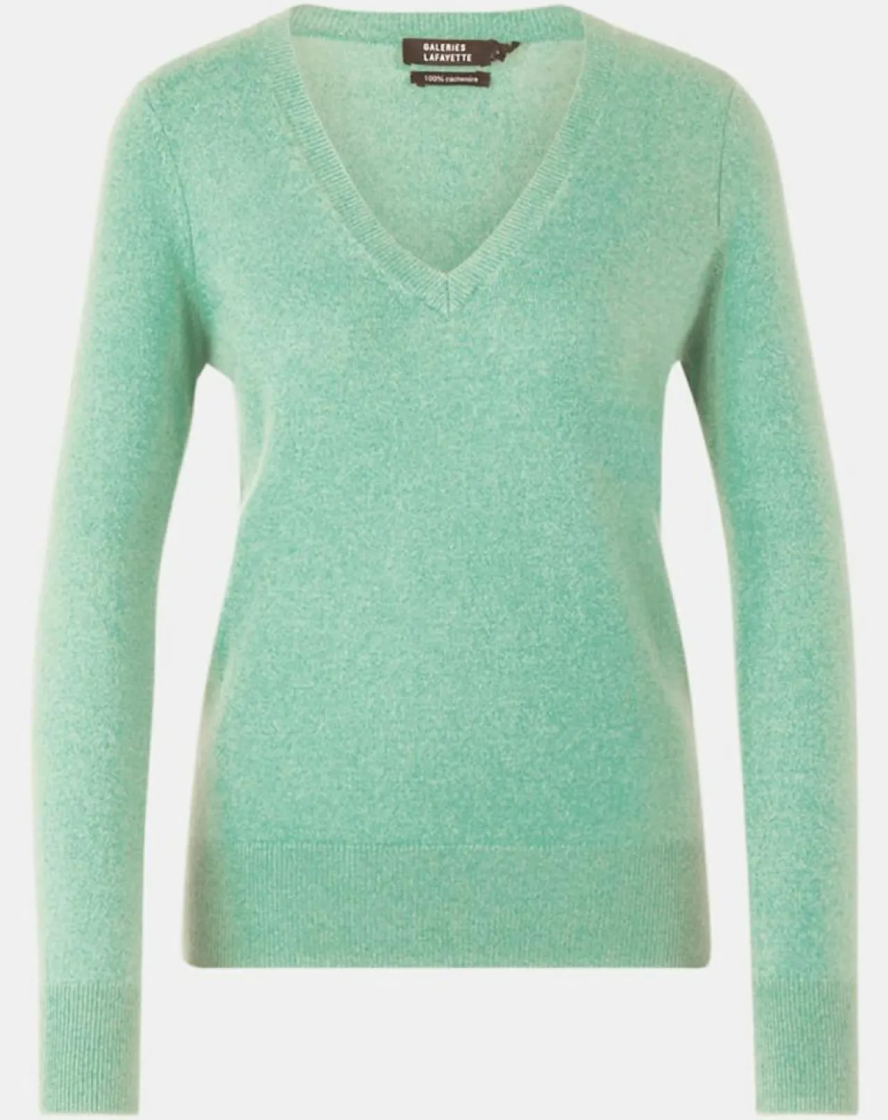 Ce pull droit Galeries Lafayette en cachemire est muni d’un col V et de finitions côtelées.